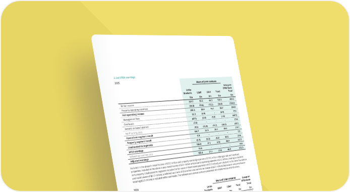2.2a) EPRA earnings Unite Students USAF LSAV Total Group on EPRA Basis Total £m £m £m £m £m Rental income 307.7 59.2 61.3 120.5 428.2 Property operating expenses (99.4) (19.6) (15.2) (34.8) (134.2) Net operating income 208.3 39.6 46.1 85.7 294.0 Management fees 22.2 (4.9) - (4.9) 17.3 Overheads (47.1) (0.6) (0.8) (1.4) (48.5) Interest on lease liabilities (7.6) - - - (7.6) Net financing costs (9.1) (12.8) (17.2) (30.0) (39.1) Operations segment result 166.7 21.3 28.1 49.4 216.1 Property segment result 5.0 - - - 5.0 Unallocated to segments (2.9) (0.2) (0.3) (0.5) (3.4) EPRA earnings 168.8 21.1 27.8 48.9 217.7 Software as a service costs 14.6 - - - 14.6 Adjusted earnings 183.4 21.1 27.8 48.9 232.3 Included in the above is rental income of £20.7 million and property operating expenses of £11.6 million relating to sale and leaseback properties. Included in the above is also rental income of £4.1 million and property operating expenses of £1.2 million, relating to a build-to rent property. Unallocated to segments includes the fair value of share-based payments of (£1.5 million), contributions to the Unite Foundation and social causes of (£1.0 million), a deferred tax credit of £3.3 million and current tax charge of (£3.1 million). Depreciation and amortisation totalling (£6.9 million) is included within overheads. The software as a service costs are presented net of deferred tax of £4.8 million. Included in the above is rental income of £20.3 million and property operating expenses of £11.5 million relating to sale and leaseback properties. Included in the above is also rental income of £4.0 million and property operating expenses of £1.2 million, relating to a build-to- rent property. Unallocated to segments includes the fair value of share-based payments of (£2.3 million), contributions to the Unite Foundation and social causes of (£0.6 million), a deferred tax credit of £2.6 million and current tax charge of (£5.1 million). Depreciation and amortisation totalling (£5.7 million) is included within overheads. The software as a service costs are presented net of deferred tax of £4.0 million. 2024 Share of joint ventures Group on EPRA basis Unite Students USAF LSAV Total Total £m £m £m £m £m Rental income 282.0 59.0 57.0 116.0 398.0 Property operating expenses (87.2) (20.7) (14.0) (34.7) (121.9) Net operating income 194.8 38.3 43.0 81.3 276.1 Management fees 21.9 (4.6) - (4.6) 17.3 Overheads (37.5) (0.5) (0.4) (0.9) (38.4) Interest on lease liabilities (8.8) - - - (8.8) Net financing costs (6.9) (11.5) (16.8) (28.3) (35.2) Operations segment result 163.5 21.7 25.8 47.5 211.0 Property segment result (3.8) - - - (3.8) Unallocated to segments (4.8) (0.2) (0.3) (0.5) (5.3) EPRA earnings 154.9 21.5 25.5 47.0 201.9 Software as a service costs 11.9 - - - 11.9 Adjusted earnings 166.8 21.5 25.5 47.0 213.8 Share of joint ventures 2025 THE UNITE GROUP PLC Annual Report and Accounts 2025 155