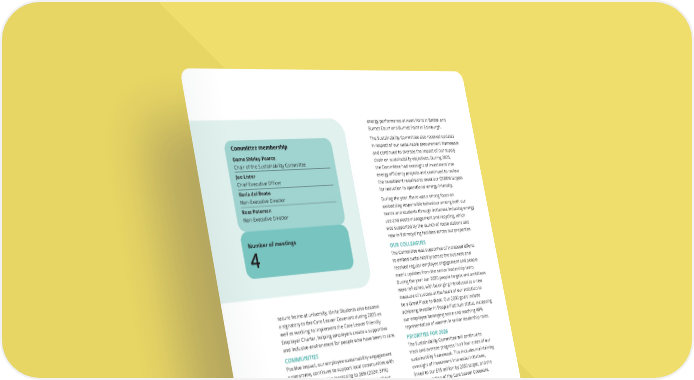 secure home at university. Unite Students also became a signatory to the Care Leaver Covenant during 2025 as well as working to implement the Care Leaver Friendly Employer Charter, helping employers create a supportive and inclusive environment for people who have been in care. COMMUNITIES Positive Impact, our employee sustainability engagement programme, continues to support local communities with employee volunteering increasing to 36% (2024: 31%) during the year. The Committee was supportive of our commitment to dedicate parts of our new and existing buildings to community spaces, recognising the significant impact for local communities and partnerships. THE ENVIRONMENT The Sustainability Committee continues to monitor our Net Zero Carbon Pathway and track progress using reporting metrics covering the key activities for delivery of our framework. With input from the Sustainability Committee, the business continues to build on recommendations from the Task Force on Climate-related Financial Disclosures (TCFD) to improve our management of climate-related risk. We received an ‘A’ rating from CDP and maintained a four-star Global ESG Benchmark for Real Assets (GRESB) rating, with our scores increasing for both operations and developments. During 2025, the Committee monitored progress towards our new development sustainability targets. Our sustainable construction framework continues to help drive progress in this area, with significant progress made in reducing both embodied carbon and designed operational energy performance at Avon Point in Bristol and Burnet Court and Burnet Point in Edinburgh. The Sustainability Committee also received updates in respect of our sustainable procurement framework and continued to oversee the impact of our supply chain on sustainability objectives. During 2025, the Committee had oversight of investment into energy efficiency projects and continued to review the investment required to meet our CRREM targets for reduction in operational energy intensity. During the year, there was a strong focus on embedding responsible behaviour among both our teams and students through initiatives including energy use and waste management and recycling, which was supported by the launch of reuse stations and new in-flat recycling facilities across our properties. OUR COLLEAGUES The Committee was supportive of increased efforts to embed sustainability across the business and received regular employee engagement and people metric updates from the senior leadership team. During the year our 2030 people targets and ambitions were refreshed, with belonging introduced as a new measure of success at the heart of our ambition to be a Great Place to Work. Our 2030 goals include achieving Investor In People Platinum status, increasing our employee belonging score and reaching 40% representation of women in senior leadership roles. PRIORITIES FOR 2026 The Sustainability Committee will continue to track and oversee progress in all four areas of our sustainability framework. This includes maintaining oversight of investment into social initiatives, linked to our £15 million by 2030 target, and the implementation of the Care Leaver Covenant. The Committee will also continue to oversee investment into energy efficiency projects during 2026 and monitor the decarbonisation and climate resilience of our business to ensure our plans remain credible and meet stakeholder expectations, while protecting the business from material financial risks. The Committee will monitor our climate-related risk exposure, management and reporting and ensure the Group’s net zero carbon amibition evolves to remain in line with emerging expectations, guidance and regulation in this area. This includes an update to our Net Zero Carbon Pathway. The implementation of our sustainable construction framework through development and university partnerships will continue to be reviewed by the Committee during 2026. Dame Shirley Pearce Chair – Sustainability Committee 24 February 2026 Committee membership Dame Shirley Pearce Chair of the Sustainability Committee Joe Lister Chief Executive Officer Ilaria del Beato Non-Executive Director Ross Paterson Non-Executive Director Number of meetings 4 THE UNITE GROUP PLC Annual Report and Accounts 2025 109