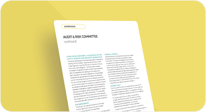 OTHER ISSUES CONSIDERED – ACCOUNTING FOR THE COST OF CLADDING AND FIRE SAFETY REMEDIATION The Group has provided for the estimated cost of remediating cladding and fire safety on properties where there is either a legal/regulatory requirement to do so or where the Group has a constructive obligation. The Committee reviewed, challenged and agreed the basis on which costs associated with the remediation of cladding and fire safety have been included in the financial statements. The Committee considered the appropriateness of where the estimated cost of remediating cladding and fire safety was provided for, versus where property valuations were adjusted to take account of anticipated future spend on properties, including to remediate cladding and fire safety. The Committee also reviewed, challenged and agreed the extent to which the Group had any legal or constructive obligations in respect of cladding and fire safety remediation. The Committee was comfortable with the process and controls adopted by management around the disclosures, and estimation of costs associated with cladding and fire safety remediation. RISK MANAGEMENT The Group’s risk assessment process and the way in which significant business risks are managed is a key area of focus for the Committee. The Committee assessed the approach to risk taken by the Group’s Executive Committee and senior leadership team. The Executive Committee is responsible for the delivery of the Group’s risk management framework. The Executive Committee and senior leadership team set the objectives for the Group and then assess what risks could prevent the Group from meeting these objectives. This assessment resulted in a number of principal and emerging risks being brought to the Board for a detailed assessment. The Committee considered and approved both the Group’s Risk Management Framework and the Group’s assessment of its principal risks and uncertainties, as set out on pages 52-71. Through these reviews, the Committee considered the risk management procedures within the business and was satisfied that the key Group risks were being appropriately managed. The risk assessment flags the importance of the internal control framework to manage risk and this forms a separate area of review for the Committee. The Board formally reviewed the Group’s principal risks at two meetings during the year. INTERNAL CONTROLS Led by the Group’s risk assessment process, we reviewed the process by which the Group evaluated its control environment. The Board has delegated responsibility to management for establishing effective risk management and maintaining adequate internal controls, although the Board retains oversight responsibility. This structure is fully detailed on page 55. Internal controls are designed to provide reasonable assurance regarding (among other things) the reliability of financial reporting and the preparation of the financial statements for external reporting purposes. A comprehensive strategic planning, budgeting and forecasting process is in place. Periodic financial information and performance insight is reported to the Board. INTERNAL AUDIT The Group used the internal Group Risk & Assurance team for internal audit services throughout the year. The team continued to undertake independent audits in our operations, utilising a framework of Operational Compliance Audits for our properties. The property audits focus on safety and, where there are gaps identified, action plans. The results are shared with our Operations Performance team, so best practice is shared to drive improvements. Also, the team completed four other pieces of internal audit work: • Compliance with Senior Accounting Officer requirements. • A follow-up on the progress of previously agreed management actions relating to internal audits from prior years. • A review of our debt collection process. • A review of estates statutory compliance. • Business continuity in information technology. The team also reviewed the principal risks and material control frameworks in preparation for the upcoming Provision 29 changes in the UK Corporate Governance Code. The Committee noted opportunities to strengthen business continuity planning in information technology, conscious of the wider macro risk environment in relation to cyber security, and following internal audit in the financial year. Opportunities have been identified to strengthen the control environment in this regard, with the Committee pleased to see remediation to provide comprehensive documentation promptly underway. The conclusion of all other audits was that there were no material issues and controls were well designed, but we noted there were some areas of improvement to be made to enhance controls and operational efficiency, which management is in the process of implementing. AUDIT & RISK COMMITTEE continued THE UNITE GROUP PLC Annual Report and Accounts 2025 106 GOVERNANCE