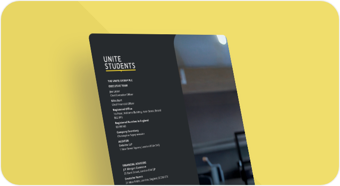 THE UNITE GROUP PLC EXECUTIVE TEAM Joe Lister Chief Executive Officer Mike Burt Chief Financial Officer Registered Office 1st Floor, Welcome Building, Avon Street, Bristol BS2 0PS Registered Number in England 03199160 Company Secretary Christopher Szpojnarowicz AUDITOR Deloitte LLP 1 New Street Square, London EC4A 3HQ FINANCIAL ADVISERS J.P. Morgan Cazenove 25 Bank Street, London E14 5JP Deutsche Numis 21 Moorfields, London, England, EC2M 6TX REGISTRAR Computershare Investor Services plc PO Box 82 The Pavilions Bridgwater Road Bristol BS99 7NH FINANCIAL PR CONSULTANTS Sodali & Co 122 Leadenhall Street City of London EC3V 4AB Find out more online at www.unitegroup.com