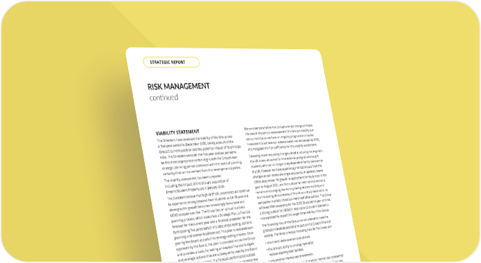 VIABILITY STATEMENT The Directors have assessed the viability of the Group over a five-year period to December 2030, taking account of the Group’s current position and the potential impact of its principal risks. The Directors consider the five-year lookout period to be the most appropriate as this aligns with the Group’s own strategic planning period combined with the levels of planning certainty that can be derived from the development pipeline. The viability assessment has been prepared including the impact of the Group’s acquisition of Empiric Student Property plc in January 2026. The Directors believe that high tariff UK universities will continue to experience strong demand from students as UK 18-year-old demographic growth becomes increasingly favourable and UCAS acceptances rise. The Group has an annual business planning process, which comprises a Strategic Plan, a financial forecast for the current year and a financial projection for the forthcoming five years (which includes stress testing, scenario planning and covenant adherence). This plan is reviewed each year by the Board as part of its strategy setting process. Once approved by the Board, the plan is cascaded across the Group and provides a basis for setting all detailed financial budgets and strategic actions that are subsequently used by the Board to monitor performance. The forecast performance outlook is also used by the Remuneration Committee to establish the targets for the annual and longer-term incentive schemes. To stress test the viability of the business, a viability scenario was prepared using the Group’s Strategic Plan as a base. The key viability assumptions were: • Income growth reduced to 1% p.a., reflecting principal risks 1 and 4. • Cost growth of 5% p.a., allowing for further sustained increases in utility and other costs. • Yield expansion of 75bps, approximately a 15% decline in asset values, reflecting principal risk 8. • Interest costs of 7% on all new and refinancing activity, reflecting principal risk 9. • No further development commitments, disposals or acquisitions, reflecting principal risks 3 and 4. The result of this scenario showed a significant deterioration in forecast performance, with earnings and NTA significantly reduced (to 37.9p and 787p respectively) in 2030 while LTV increased substantially to 42%. Despite the significant contraction in the size of the business over the forecast period, the business would remain viable under such a scenario. We considered whether the Group’s climate change principal risk would impact our assessment of the Group’s viability but concurred that as we have an ongoing programme of capital investment to achieve our science-based net zero target by 2030, this mitigated the risk sufficiently for this viability assessment. Following recent visa policy changes aimed at reducing net migration, the UK is less attractive for international postgraduate taught students who can no longer bring dependent family members to the UK, however we have experienced limited impact from the changes as our rooms are single occupancy. In addition, Home Office data shows 7% growth in applications for study visas in the year to August 2025, and the outlook for international demand remains encouraging thanks to growing student mobility and the increasing attractiveness of the UK as a study destination as competitor markets introduce more restrictive policies. The Group achieved 95% occupancy for the 2025/26 academic year and has a strong outlook for 2026/27. International student demand is not expected to impact the longer-term viability of the Group. The financing risks of the Group are considered to have the greatest immediate potential impact on the Group’s financial viability. The three principal financing risks for the Group are: • short-term debt covenant compliance • the Group’s ability to arrange new debt/ replace expiring debt facilities • any adverse interest rate movements. To hedge against the potential of adverse interest rate movements the Group manages its exposure with a combination of fixed rate facilities and using interest rate swaps for its floating rate debt. During the year, the Group has complied with all covenant requirements attached to its financing facilities and expects to continue to do so. The outlook and future prospects beyond the viability period for the business remain strong, reflecting the underlying strength of student demand, our alignment to the strongest universities and the capabilities of our best-in-class operating platform. There are significant growth opportunities for the business created by the ongoing shortage of high quality and affordable PBSA, universities needing to deliver an exceptional student experience through their accommodation and the growing awareness of the benefits of PBSA among non-first-year students. Emerging risks to the outlook and prospects are identified and assessed through our broader risk management process. Based on their assessment and the mitigating actions available, the Directors have a reasonable expectation that the Group will be able to continue in operation and meet its liabilities as they fall due over the period to December 2030. RISK MANAGEMENT continued THE UNITE GROUP PLC Annual Report and Accounts 2025 62 STRATEGIC REPORT