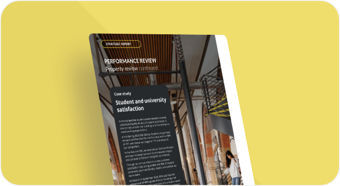 PERFORMANCE REVIEW Property review continued Case study Student and university satisfaction In the competitive student accommodation market, understanding the drivers of student satisfaction is vital to help us tailor our buildings and the services to meet evolving expectations. In the Spring 2025 GSLI (Global Student Living Index) we were certified Gold for the first time, with an NPS of +21, well above our target of +11 and ahead of our competitors. In the Autumn GSLI, we retained our Gold certification and saw increased scores in Environmental Impact and achieved a Platinum rating for our Internet. Through our annual check-in survey, customer satisfaction held strong at 86% and 96% of student comments said how friendly, helpful and positive our teams were. At check-in in September 2025, 93% said they felt welcome while 88% agreed that our buildings met their expectations. The hard work of our teams meant that 29% of our city clusters maintained or improved their score, with Cardiff, Durham and Nottingham recording the highest NPS scores at 75.9, 65.8 and 62.1 respectively. The universities we work with also expressed satisfaction. Our 2025 Higher Education satisfaction score was +40, our highest on record and +3-point increase from 2024. Our trust score, based on five trust metrics, such as providing excellent services and a high standard of accommodation also improved +1 point (it was 81 in 2025, 80 in 2024). THE UNITE GROUP PLC Annual Report and Accounts 2025 34 STRATEGIC REPORT