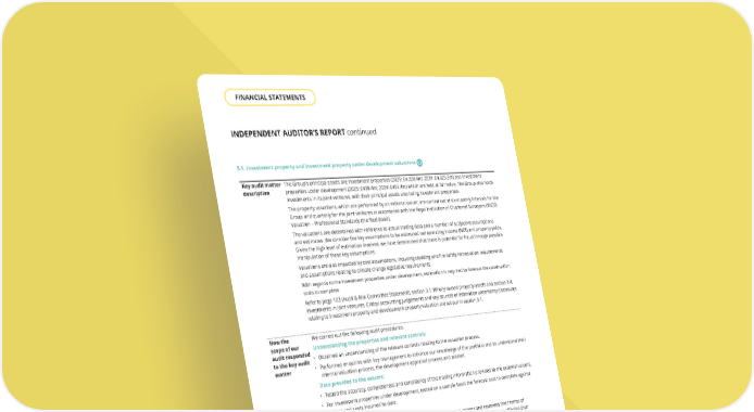 5.1. Investment property and investment property under development valuations Key audit matter description The Group’s principal assets are investment properties (2025: £4,220.4m; 2024: £4,025.5m) and investment properties under development (2025: £438.4m; 2024: £451.4m) which are held at fair value. The Group also holds investments in its joint ventures, with their principal assets also being investment properties. The property valuations, which are performed by an external valuer, are carried out at six-monthly intervals for the Group and quarterly for the joint ventures in accordance with the Royal Institution of Chartered Surveyors (‘RICS’) Valuation – Professional Standards (the ‘Red Book’). The valuations are determined with reference to actual trading data and a number of subjective assumptions and estimates. We consider the key assumptions to be estimated net operating income (NOI) and property yields. Given the high level of estimation involved, we have determined that there is potential for fraud through possible manipulation of these key assumptions. Valuations are also impacted by cost assumptions, including cladding and fire-safety remediation requirements and assumptions relating to climate change legislative requirements. With regards to the investment properties under development, estimation is required to forecast the construction costs to complete. Refer to page 103 (Audit & Risk Committee Statement), section 3.1: Wholly owned property assets and section 3.4: Investments in joint ventures. Critical accounting judgements and key sources of estimation uncertainty disclosures relating to investment property and development property valuation are set out in section 3.1. How the scope of our audit responded to the key audit matter We carried out the following audit procedures: Understanding the properties and relevant controls: • Obtained an understanding of the relevant controls relating to the valuation process. • Performed enquiries with key management to enhance our knowledge of the portfolio and to understand their internal valuation process, the development appraisal process and market. Data provided to the valuers: • Tested the accuracy, completeness and consistency of the trading information provided to the external valuers. • For investment properties under development, tested on a sample basis the forecast cost to complete against budget and costs incurred to date. External valuation: • Assessed the objectivity, competence and capability of the external valuers and reviewed their terms of engagement with the Group to determine whether there were any matters that might have affected their objectivity or may have imposed scope limitations on their work. • With the assistance of our internal real estate valuation specialists, benchmarked the assumptions used against market data, including relevant transactions to identify individual properties where the key assumptions (estimated net operating income (NOI) and property yields) were considered outliers to our expected range. • Along with our internal real estate valuation specialists, met with the external valuer and made enquiries of their views of the broader market and relating to the results of their work on the sample of properties. • Made enquiries of the external valuers as to whether any special assumptions had been made and how they approach the impact of climate change, cladding and fire-safety remediation in the valuations. • Assessed the valuation methodology used and considered compliance with the Red Book guidance. • Tested the integrity of the model used by the external valuer through recalculation. • Reconciled the external valuation reports to underlying financial records to test for completeness and accuracy within the Group’s financial statements. • Compared the property specific assumptions to assess whether there is consistency within the portfolio as well as consistency with related assumptions used in other estimates. Disclosures: • Assessed the appropriateness of the Group’s valuation disclosures, including the related sensitivities included within the financial statements. Key observations We concluded that valuation of investment property and investment property under development is appropriate. INDEPENDENT AUDITOR’S REPORT continued THE UNITE GROUP PLC Annual Report and Accounts 2025 140 FINANCIAL STATEMENTS