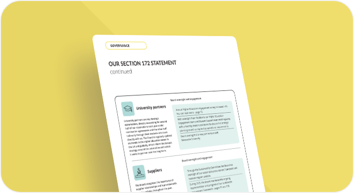 OUR SECTION 172 STATEMENT continued University partners Suppliers Communities and the environment University partners are key strategic stakeholders, directly accounting for around half of our reservations each year under nomination agreements and the other half indirectly through their students who book directly with us. The Board is regularly updated on trends in the Higher Education sector in the UK and globally, which inform the Group’s strategy around the universities with which it seeks to partner over the long term. We seek to play an active role in local communities and build trusted, long-term relationships with community partners. As a Great Place to Live, Work and Invest, we proactively manage environmental, social and governance risks. The Board recognises the importance of supplier relationships and is provided with regular updates throughout the year. Annual Higher Education engagement survey increased +40. You can read more – page 15. With oversight from the Board, our Higher Education Engagement team and Student Support team meet regularly with university leaders and teams to discuss this strategic planning as well as day-to-day operational requirements. Board oversight of a new joint venture with Newcastle University. Board oversight and engagement Through the Sustainability Committee, the Board has oversight of our sustainable procurement framework and receives regular updates. During 2025, the Board monitored the ongoing implementation and progress of our sustainable procurement framework - pages 11 and 109. Board oversight and engagement The Board and Sustainability Committee received regular updates on our Positive Impact programme. Through the Sustainability Committee, the Board has oversight of our environmental impact through continued review of our sustainability framework - pages 83 and 109. During 2025, the Board supported our commitment to deliver 1,000 new beds in our local communities. Board oversight and engagement THE UNITE GROUP PLC Annual Report and Accounts 2025 92 GOVERNANCE