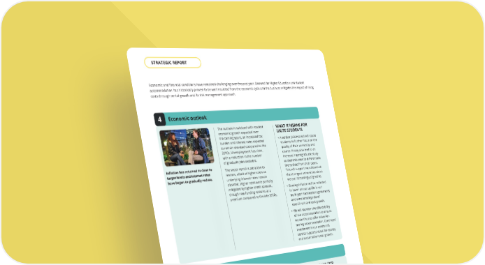 Economic and financial conditions have remained challenging over the past year. Demand for Higher Education and student accommodation has historically proven to be well insulated from the economic cycle and the business mitigates the impact of rising costs through rental growth and its risk management approach. Inflation has returned to close to target levels and interest rates have begun to gradually reduce. The outlook is subdued with modest economic growth expected over the coming years, an increased tax burden and interest rates expected to remain elevated compared to the 2010s. Unemployment has risen, with a reduction in the number of graduate jobs available. The sector remains attractive to lenders, albeit at higher costs as underlying interest rates remain elevated. Higher rates were partially mitigated by tighter credit spreads, though new funding remains at a premium compared to the late 2010s. 4 Economic outlook WHAT IT MEANS FOR UNITE STUDENTS • A weaker jobs market will cause students to further focus on the quality of their university and course. It may also lead to an increase in postgraduate study as students seek to differentiate themselves from their peers. This will support recruitment at the strongest universities which we are increasingly aligned to. • Slowing inflation will be reflected in lower annual uplifts in our multi-year nomination agreements and a moderating rate of overall rent and cost growth. • We will monitor the affordability of our accommodation to ensure we continue to offer value-for- money accommodation. Continued investment in our assets and service supports value-for-money and sustainable rental growth. Universities have responded to changing international demand since 2024 by increasing recruitment of UK students. This is most stark at Higher Tariff universities where UCAS acceptances increased by 8% for the 2025/26 academic year, compared to 2% growth at Medium Tariff and a 2% reduction at Low Tariff providers. Changing student recruitment patterns resulted in weaker demand in a handful of regional cities and contributed to our 95.2% occupancy for the 2025/26 academic year. UK students are focused on value-for- money, with a growing trend of those at lower-ranked universities likely to live at home. The most enduring accommodation demand is at the strongest universities, where we are increasing our alignment. International students are increasingly focused on quality of education and alternatives outside of the traditional leading study destinations. This is mitigated by the UK’s more settled international student policy and openess compared to the US, Australia and Canada. WHAT IT MEANS FOR UNITE STUDENTS • We will accelerate the alignment of our portfolio to the strongest universities which have the best prospects for student recruitment and demand for accommodation. • Shifting demand underlines the value of our nomination agreements and relationships with universities, which underpins sales each academic year. • Universities needing new accommodation to grow are increasingly seeking to partner with the private sector, including Unite Students, creating opportunities for new nomination agreements and university joint ventures. 5 University recruitment THE UNITE GROUP PLC Annual Report and Accounts 2025 06 STRATEGIC REPORT
