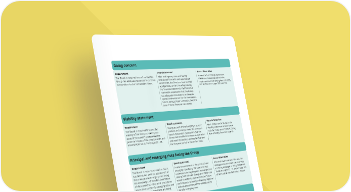 THE UNITE GROUP PLC Annual Report and Accounts 2025 81 Requirement The Board is required to confirm that the Group has adequate resources to continue in operation for the foreseeable future. Board statement After making enquiries and having considered forecasts and appropriate sensitivities, the Directors have formed a judgement, at the time of approving the financial statements, that there is a reasonable expectation that the Group has adequate resources to continue in operational existence for the foreseeable future, being at least 12 months from the date of these financial statements. More information More details on the going concern statement, in accordance with the requirements of UK Listing Rule 6.6.6R(3), can be found on pages 152 and 153. Going concern Requirement The Board is required to assess the viability of the Company taking into account the current position and the potential impact of the principal risks and uncertainties set out on pages 52 - 71. Board statement Taking account of the Company’s current position and principal risks, the Directors have a reasonable expectation that the Group will be able to continue in operation and meet its liabilities as they fall due over the five-year period to December 2030. More information More details can be found in the viability statement in accordance with the requirements of UK Listing Rule 6.6.6R(3) found on page 62. Viability statement Requirement The Board is required to confirm that it has carried out a robust assessment of the principal and emerging risks facing the Company and include a description of these principal risks, what procedures are in place to identify emerging risks, and an explanation of how these are being managed or mitigated. Board statement A robust assessment of the principal and emerging risks facing the Company was undertaken during the year, including those arising from climate change and those that would threaten its business model, future performance, solvency or liquidity, together with an assessment of the procedures to identify emerging risks. More information Information around key risks and risk management processes and how they are being managed or mitigated can be found on pages 52 - 71 and on page 106 of the Audit & Risk Committee Report. Principal and emerging risks facing the Group Requirement In accordance with Provision 29 of the Code (as applicable to the year ending 31 December 2025) the Board is required to monitor the Company’s risk management and internal control systems and, at least annually, carry out a review of their effectiveness and report on that review in the Annual Report. Board statement A Board review of the effectiveness of internal controls, supported by internal audit and their reports to the Audit & Risk Committee. Areas for improvement were highlighted through these reports. We are working on action plans to strengthen the control framework. More information Details on the systems of risk management and internal control and the review of their effectiveness can be found on page 106. Risk management and internal control Requirement In accordance with Provision 27 of the Code the Board should confirm that it considers the Annual Report, taken as a whole, is fair, balanced and understandable and provides the information necessary for shareholders to assess the Company’s position and performance, business model and strategy. Board statement The Directors consider that the Annual Report, taken as a whole, is fair, balanced and understandable and provides the information necessary for shareholders to assess the Company’s position and performance, business model and strategy. More information See the Audit & Risk Committee Report on pages 103. Fair, balanced and understandable