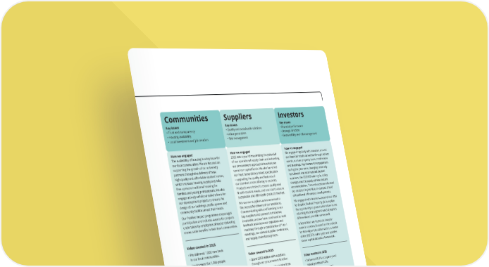 How we engaged 2025 was a year of maximising the potential of our operational supply chain and extending our procurement approach into where we spend our capital funds. We also launched our Next Generation product specification – upgrading the quality and features of our standard room offering to students. Products were tested to ensure quality and fit with student needs, and sourced to ensure sustainable and affordable products that last. We see our suppliers as instrumental to the successful delivery of our ambitions. Communicating with and listening to our key suppliers and partners is therefore invaluable, and we have continued to seek feedback and share our objectives and roadmap through a combination of 1-to-1 meetings, our annual supplier conference, and supply chain focus groups. Value created in 2025 • Spent £283 million with suppliers through our procurement function. • Delivered higher quality service from suppliers, with a specific focus on specification and services during the summer maintenance period. • Reduced risk through an enhanced supplier vetting process and increased attention to managing supplier quality and performance. Priorities for 2026 We will further expand our procurement processes into asset management and new developments, as well as continuing to mitigate the macro cost pressures evident in our operational and estates supply chain. A review of our supply chain – not just those we contract directly with – has commenced, and we expect to see the result of this during 2026. How we engaged The availability of housing is a key issue for our local communities. We are focused on supporting the growth of our university partners through the delivery of new, high-quality and affordable student homes, which increase housing supply and help free up more traditional housing for families and young professionals. We also engage actively with local stakeholders for our development projects to ensure the design of our buildings, public spaces and community facilities meet their needs. Our Positive Impact programme encourages participation and includes awards for projects undertaken by employees aimed at delivering measurable benefits in their local communities. Value created in 2025 • We delivered 1,000 new beds in our local communities. • Employment for 1,266 people in our local communities. • Invested £6.9m million in initiatives to reduce our environmental impact. • 3,894 hours of employee volunteering in the year, a participation rate of 36%. Priorities for 2026 We aim to increase community engagement through our Positive Impact programme, via initiatives delivered by local teams in our properties. In addition, we will continue to engage with local authorities and local communities around new development activity, to explain how the community benefits from creating new, high-quality student accommodation. Delivery of a new sixth-form academy at our new development Hawthorne House, in East London. How we engaged We engaged regularly with investors around our financial results as well as through ad-hoc events, such as property tours, conferences and meetings. Key themes for engagement during the year were, changing university recruitment and international student numbers, the 2025/26 sales cycle, policy changes and the supply of new student accommodation. These discussions informed our decision to prioritise on-campus ahead of traditional off-campus developments. We engaged with investors ahead of our offer for Empiric Student Property plc to explain the opportunity to grow market share in the returning student segment which Empiric’s differentiated portfolio serves well. In November, we hosted an investor event in London, focused on the outlook for the Higher Education sector, a review of the 2025/26 sales cycle and updates to our capital allocation framework. Value created in 2025 • Delivered 95.2% occupancy and rental growth of 4.0%. • 2% growth in adjusted EPS. • Total accounting return of 2.1%. • Full year dividend per share of 37.7 p. Priorities for 2026 Delivering strong operational performance and sales for the 2026/27 academic year, while effectively managing our cost base. We will increase the run rate of disposals to £300–400 million p.a., deploying surplus capital into university partnerships and share buybacks. We will implement our business plan for Empiric, including starting to deliver £17 million of synergies. Communities Key issues • Trust and transparency • Housing availability • Local investment and job creation Suppliers Key issues • Quality and sustainable solutions • Value generation • Risk management Investors Key issues • Financial performance • Strategic direction • Sustainability and risk management THE UNITE GROUP PLC Annual Report and Accounts 2025 11