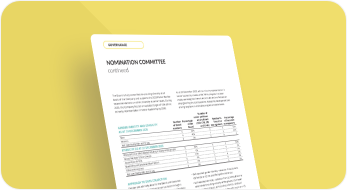NOMINATION COMMITTEE continued The Board is fully committed to ensuring diversity at all levels of the Company and supports the 2023 Parker Review recommendations on ethnic diversity at senior levels. During 2025, the Company has set an updated target of 12% ethnic minority representation in senior leadership by 2030. As at 31 December 2025, ethnic minority representation in senior leadership stands at 9%. While progress has been made, we recognise there is more to do and are focused on strengthening the talent pipeline, leadership development and driving long-term sustainable progress at senior levels. GENDER IDENTITY AND ETHNICITY AS AT 31 DECEMBER 2025 Number of Board members Percentage of the Board Number of senior positions on the Board (CEO, CFO, SID and Chair) Number in Executive management Percentage of Executive management Men 6 60% 3 3 50% Women 4 40% 1 3 50% Not specified/prefer not to say 0 0% 0 0 0 ETHNICITY AS AT 31 DECEMBER 2025 White British or other White (including minority-white groups) 9 90% 4 5 83% Mixed/Multiple Ethnic Groups 0 0% 0 0 0% Asian/Asian British 1 10% 0 1 17% Black/African/Caribbean/Black British 0 0% 0 0 0% Other ethnic group 0 0% 0 0 0% Not specified/prefer not to say 0 0% 0 0 0% APPROACH TO DATA COLLECTION Gender and ethnicity data for the Board and Executive management is collected on an annual basis through a standardised process managed by the Company Secretary. Each Director and member of the Executive management team is asked to complete a standard form questionnaire on a confidential and voluntary basis, through which the individual self-reports on their ethnicity and gender identity (or can specify that they do not wish to provide such data). The criteria of the questionnaire are aligned to the definitions specified in the UK Listing Rules and set out in the tables above: • Self-reported gender identity – selection from (a) male, (b) female or (c) not specified/prefer not to say. • Self-reported ethnicity – selection from (a) White British or other white (including minority-white groups), (b) mixed/ multiple ethnic groups, (c) Asian/Asian British, (d) Black/ African/Caribbean/Black British, (e) other ethnic group or (f) not specified/prefer not to say. The Company’s approach to data collection is consistent for the purposes of all diversity-related reporting requirements under the Listing Rules and across all individuals in relation to whom data is being reported. Gender diversity for the purposes of the UK Corporate Governance Code. GENDER DIVERSITY As of 31 December 2025, the number of women in the Executive Committee and their direct reports (including the Company Secretary as required by the UK Corporate Governance Code) was 11 (out of a total of 35) representing 31% of this Group. Male Female Total Executive Committee (including Company Secretary) 4 3 7 Direct Reports 20 8 28 Total 24 11 35 Total (%) 69% 31% 100% Richard Huntingford Chair – Nomination Committee 24 February 2026 THE UNITE GROUP PLC Annual Report and Accounts 2025 102 GOVERNANCE