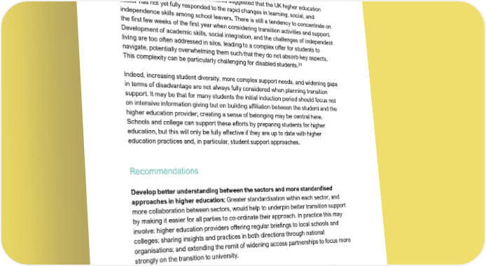 Improving the Transition to Higher Education | 2024 Internal Improving Transition Support "They've got used to the safety net of home and school, and they don't want to lose it – especially those with mental health issues and anxiety. Not having support is a real fear. They also have concerns about their social wellbeing. They 1 want a community and to feel like they belong.= Secondary school teacher Insight collected through the roundtables suggested that the UK higher education sector has not yet fully responded to the rapid changes in learning, social, and independence skills among school leavers. There is still a tendency to concentrate on the first few weeks of the first year when considering transition activities and support. Development of academic skills, social integration, and the challenges of independent living are too often addressed in silos, leading to a complex offer for students to navigate, potentially overwhelming them such that they do not absorb key aspects. This complexity can be particularly challenging for disabled students.24 Indeed, increasing student diversity, more complex support needs, and widening gaps in terms of disadvantage are not always fully considered when planning transition support. It may be that for many students the initial induction period should focus not on intensive information giving but on building affiliation between the student and the higher education provider; creating a sense of belonging may be central here. Schools and college can support these efforts by preparing students for higher education, but this will only be fully effective if they are up to date with higher education practices and, in particular, student support approaches. Recommendations Develop better understanding between the sectors and more standardised approaches in higher education: Greater standardisation within each sector, and more collaboration between sectors, would help to underpin better transition support by making it easier for all parties to co-ordinate their approach. In practice this may involve: higher education providers offering regular briefings to local schools and colleges; sharing insights and practices in both directions through national organisations; and extending the remit of widening access partnerships to focus more strongly on the transition to university. Sector-wide agreement on best practices - and terminology - in supporting the transition to university should also be considered. This would help schools and colleges to work more closely with higher education on transition activities and would offer enhanced clarity for new students. 19