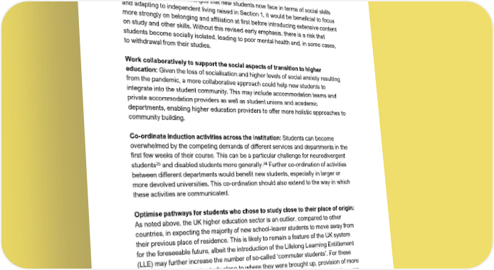 Improving the Transition to Higher Education | 2024 Internal Focus first on engagement and belonging: Higher education courses typically include introductory content to support independent study skills. However, this is often delivered over a relatively short period of time and at the same time as students are adjusting to the demands of settling in, making new friends and, in many cases, living independently for the first time. It is difficult for students to learn new skills when they are going through such a profound change and may be feeling anxious and alienated. Noting the increased challenges that new students now face in terms of social skills and adapting to independent living raised in Section 1, it would be beneficial to focus more strongly on belonging and affiliation at first before introducing extensive content on study and other skills. Without this revised early emphasis, there is a risk that students become socially isolated, leading to poor mental health and, in some cases, to withdrawal from their studies. Work collaboratively to support the social aspects of transition to higher education: Given the loss of socialisation and higher levels of social anxiety resulting from the pandemic, a more collaborative approach could help new students to integrate into the student community. This may include accommodation teams and private accommodation providers as well as student unions and academic departments, enabling higher education providers to offer more holistic approaches to community building. Co-ordinate induction activities across the institution: Students can become overwhelmed by the competing demands of different services and departments in the first few weeks of their course. This can be a particular challenge for neurodivergent 25 24 students and disabled students more generally. Further co-ordination of activities between different departments would benefit new students, especially in larger or more devolved universities. This co-ordination should also extend to the way in which these activities are communicated. Optimise pathways for students who chose to study close to their place of origin: As noted above, the UK higher education sector is an outlier, compared to other countries, in expecting the majority of new school-leaver students to move away from their previous place of residence. This is likely to remain a feature of the UK system for the foreseeable future, albeit the introduction of the Lifelong Learning Entitlement (LLE) may further increase the number of so-called 8commuter students9. For these students who choose to study close to where they were brought up, provision of more guidance should be possible to help them navigate their transition. Moreover, in areas where local progression is more common, higher education providers may wish to develop a more planned and structured approach to transition that starts during Level 3 study (or earlier) and extends further into the first year of higher education. 20