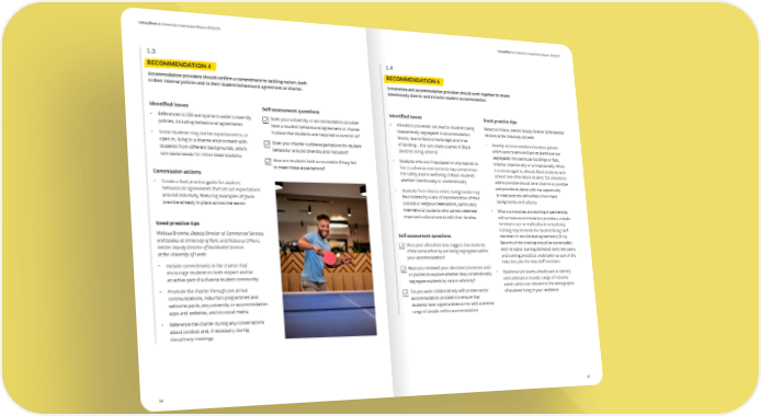 Living Black at University Commission Report 2022/23 Living Black at University Commission Report 2022/23 1.3 1.4 RECOMMENDATION 4 RECOMMENDATION 6 Accommodation providers should con昀椀rm a commitment to tackling racism, both Universities and accommodation providers should work together to create in their internal policies and in their student behavioural agreement or charter. intentionally diverse and inclusive student accommodation. Identi昀椀ed issues Self-assessment questions Identi昀椀ed issues Good practice tips • References to DEI are sparse in wider university Does your university or accommodation provider • Allocation processes can lead to students being Rebecca O’Hare, Interim Deputy Director of Residential policies, including behavioural agreements have a student behavioural agreement or charter inadvertently segregated in accommodation Services at the University of Leeds: • Some students may not be experienced in, or in place that students are required to commit to? blocks, due to factors like budget and time • Develop accommodation allocation policies open to, living in a diverse environment with Does your charter outline expectations for student of booking – this can create a sense of Black which work to ensure Black students are not students from di昀昀erent backgrounds, which behaviour around diversity and inclusion? students being othered segregated into particular buildings or 昀氀ats, can cause issues for minoritised students How are students held accountable if they fail • Students who are ill-equipped or unprepared to whether intentionally or unintentionally. While to meet these expectations? live in a diverse environment may compromise it is encouraged to allocate Black students with Commission actions the safety and/or wellbeing of Black students, at least one other Black student, 昀氀at allocations whether intentionally or unintentionally where possible should be as diverse as possible • Create a best practice guide for student • Students from diverse ethnic backgrounds may and provide students with the opportunity behavioural agreements that set out expectations feel isolated by a lack of representation of their to meet and mix with others from many around inclusivity, featuring examples of good cultural or religious celebrations, particularly backgrounds and cultures practice already in place across the sector international students who cannot celebrate • Where universities are working in partnership important cultural events with their families with private accommodation providers, include Good practice tips minimum race or multicultural competency training requirements for student facing sta昀昀 Melissa Browne, Deputy Director of Commercial Services Self-assessment questions members in service level agreements (SLAs). and Estates at University of Kent, and Rebecca O’Hare, Does your allocation data suggest that students Records of this training should be stored safely Interim Deputy Director of Residential Services of the same ethnicity are being segregated within with refresher training delivered every two years, at the University of Leeds: your accommodation? and training should be undertaken as part of the • Include commitments in the charter that induction plan for new sta昀昀 members encourage students to both respect and be Have you reviewed your allocation processes and/ or policies to explore whether they unintentionally • Residence Life teams should seek to identify an active part of a diverse student community segregate students by race or ethnicity? and celebrate a broader range of inclusive • Promote the charter through pre-arrival events which are relevant to the demographic communications, induction programmes and Do you work collaboratively with private sector of students living in your residence welcome packs, any university or accommodation accommodation providers to ensure that apps and websites, and on social media students have opportunities to mix with a diverse range of people within accommodation • Reference the charter during any conversations about conduct and, if necessary, during disciplinary meetings 16 17