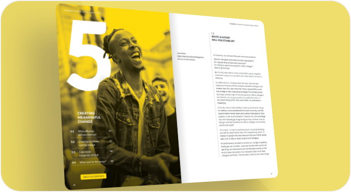 Living Black at University Commission Report 2022/23 Living Black at University Commission Report 2022/23 5.1 WHITE ALLYSHIP: WILL YOU STAND UP? Jenny Shaw As I stood up, my mind was 昀椀lled with a thousand questions. Higher Education External Engagement 'How can I talk about racism when I’ve never experienced it?' Director at Unite Students 'Am I appropriating someone else’s experience?' 'Am I taking an opportunity away from a Black colleague?' 'What if I get it wrong?' But the alternative was to remain seated while a grave inequality continued to play out on my watch, and I didn’t want to do that. So I stood up. As a White person, I recognise that I will never have the lived experience of racism and discrimination that Black colleagues and students have. But I also know that I have a responsibility to use this privilege to help create positive change. This involves actively listening to and learning from the perspectives of Black colleagues and students, and using my position to amplify their voices. It also means taking action, even when it feels uncomfortable or challenging. As an ally, I have a responsibility to stand up and lead the charge on creating a more equitable and inclusive community, one that CREATING supports better mental health and a sense of belonging for Black MEANINGFUL students in their accommodation. I must do this in the knowledge CHANGE that I will inevitably get things wrong at times, and that I must be willing to both take feedback from Black colleagues and students, and educate myself. 5.1 White Allyship: 41 This is hard – it’s hard to lead when you’re constantly doubting will you stand up? yourself. But what’s harder than this is experiencing racism. So instead, I’m going to talk about the work that we as White people 5.2 Creating a business 43 need to do to help our Black students and colleagues. case for change First and foremost, we need to summon our courage to (speaking 5.3 Case study: 46 frankly) get over ourselves – push past the discomfort and do the University of Kent right thing. As a close second, we must educate ourselves so that we don’t place the burden of our education solely on our Black 5.4 What next for the sector? 48 colleagues and friends. Then we need to stand up and create change. BACK TO CONTENTS 4040 41