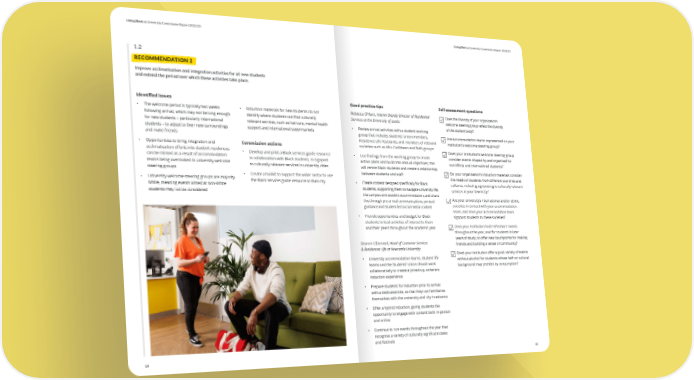 Living Black at University Commission Report 2022/23 Living Black at University Commission Report 2022/23 1.2 RECOMMENDATION 2 Improve acclimatisation and integration activities for all new students and extend the period over which these activities take place. Good practice tips Self-assessment questions Identi昀椀ed issues • The welcome period is typically two weeks • Induction materials for new students do not Rebecca O’Hare, Interim Deputy Director of Residential Does the diversity of your organisation’s Services at the University of Leeds: following arrival, which may not be long enough identify where students can 昀椀nd culturally welcome steering group re昀氀ect the diversity for new students – particularly international relevant services, such as haircare, mental health • Review arrival activities with a student working of the student body? students – to adjust to their new surroundings support and international supermarkets group that includes students’ union members, and make friends Are accommodation teams represented on your Residence Life Assistants, and members of relevant institution’s welcome steering group? • Opportunities to bring integration and Commission actions societies such as Afro Caribbean and faith groups acclimatisation e昀昀orts into student residences Does your institution’s welcome steering group can be missed as a result of accommodation • Develop and pilot a Black services guide resource • Use 昀椀ndings from the working group to create consider events shaped by and organised for in collaboration with Black students, to signpost teams being overlooked in university welcome action plans and build into annual objectives; this non-White and international students? steering groups to culturally relevant services in university cities will centre Black students and create a relationship Do your organisation’s induction materials consider • Create a toolkit to support the wider sector to use between students and sta昀昀 • University welcome steering groups are majority the Black services guide resource in their city the needs of students from di昀昀erent countries and White, meaning events aimed at non-White • Create content designed speci昀椀cally for Black cultures, including signposting to culturally relevant students may not be considered students, supporting them to navigate university life, services in your town/city? the campus and student accommodation, and share this through pre-arrival communications, printed Are your university’s international and/or ethnic guidance and student-led social media content societies in contact with your accommodation team, and does your accommodation team • Provide opportunities and budget for Black signpost students to these societies? students to lead activities of interest to them and their peers throughout the academic year Does your institution hold ‘refreshers’ events throughout the year, and for students in later years of study, to o昀昀er new touchpoints for making Sharon O’Donnell, Head of Customer Services friends and building a sense of community? & Residences Life at Newcastle University: Does your institution o昀昀er a good variety of events • University accommodation teams, student life without alcohol for students whose faith or cultural teams and the Students’ Union should work background may prohibit its consumption? collaboratively to create a joined-up, coherent induction experience • Prepare students for induction prior to arrival with a dedicated site, so that they can familiarise themselves with the university and city in advance • O昀昀er a hybrid induction, giving students the opportunity to engage with content both in-person and online • Continue to run events throughout the year that recognise a variety of culturally signi昀椀cant dates and festivals 14 15