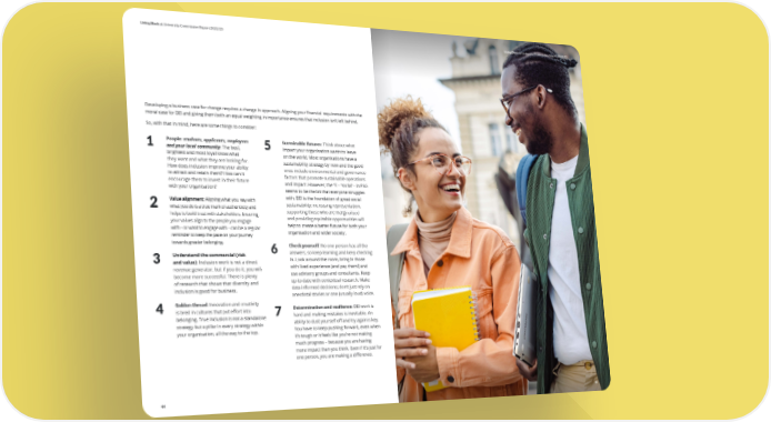 Living Black at University Commission Report 2022/23 Living Black at University Commission Report 2022/23 Developing a business case for change requires a change in approach. Aligning your 昀椀nancial requirements with the moral case for DEI and giving them both an equal weighting in importance ensures that inclusion isn’t left behind. So, with that in mind, here are some things to consider: 1 People: students, applicants, employees 5 Sustainable futures: Think about what and your local community: The best, impact your organisation wants to leave brightest and most loyal know what on the world. Most organisations have a they want and what they are looking for. sustainability strategy by now and the good How does inclusion improve your ability ones include environmental and governance to attract and retain them? How can it factors that promote sustainable operations encourage them to invest in their future and impact. However, the ‘S’ – ‘social’ – in ESG with your organisation? seems to be the bit that everyone struggles Value alignment: Aligning what you say with with. DEI is the foundation of great social 2 what you do is a true mark of authenticity and sustainability: increasing representation, helps to build trust with stakeholders. Ensuring supporting those who are marginalised your values align to the people you engage and providing equitable opportunities will with – or want to engage with – can be a regular help to create a better future for both your reminder to keep the pace on your journey organisation and wider society. towards greater belonging. 6 Check yourself: No one person has all the Understand the commercial (risk answers, so keep learning and keep checking 3 and value): Inclusion work is not a direct in. Look around the room, bring in those revenue generator, but if you do it, you will with lived experience (and pay them!) and become more successful. There is plenty use advisory groups and consultants. Keep of research that shows that diversity and up-to-date with contextual research. Make inclusion is good for business. data-informed decisions; don’t just rely on anecdotal stories or one (usually loud) voice. 4 Golden thread: Innovation and creativity Determination and resilience: DEI work is is bred in cultures that put e昀昀ort into 7 hard and making mistakes is inevitable. An belonging. True inclusion is not a standalone strategy but a pillar in every strategy within ability to dust yourself o昀昀 and try again is key. your organisation, all the way to the top. You have to keep pushing forward, even when it’s tough or it feels like you’re not making much progress – because you are having more impact than you think. Even if it’s just for one person, you are making a di昀昀erence. 44 45