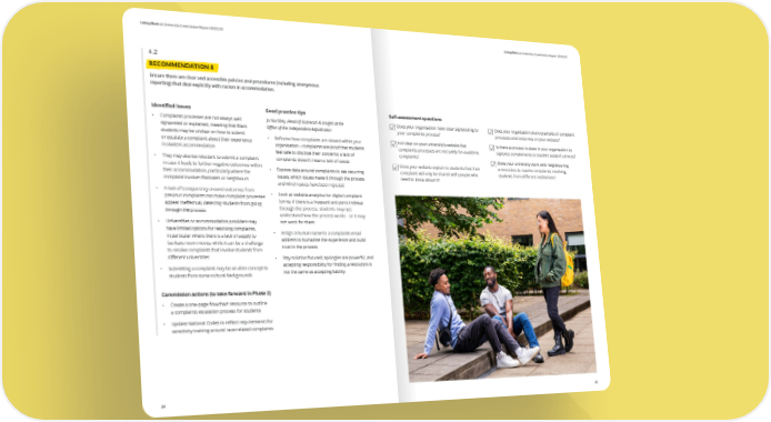 Living Black at University Commission Report 2022/23 Living Black at University Commission Report 2022/23 4.2 RECOMMENDATION 8 Ensure there are clear and accessible policies and procedures (including anonymous reporting) that deal explicitly with racism in accommodation. Identi昀椀ed issues Good practice tips Self-assessment questions • Complaints processes are not always well Jo Nuckley, Head of Outreach & Insight at the Does your organisation have clear signposting to Does your organisation share examples of complaint signposted or explained, meaning that Black O昀케ce of the Independent Adjudicator: your complaints process? processes and outcomes on your website? students may be unclear on how to submit • Reframe how complaints are viewed within your Is it clear on your university’s website that Is there a process in place in your organisation to or escalate a complaint about their experience organisation – complaints are proof that students complaints processes are not solely for academic signpost complainants to student support services? in student accommodation complaints? feel safe to disclose their concerns; a lack of Does your university work with neighbouring • They may also be reluctant to submit a complaint complaints doesn’t mean a lack of issues Does your website explain to students that their universities to resolve complaints involving in case it leads to further negative outcomes within • Explore data around complaints to see recurring complaint will only be shared with people who students from di昀昀erent institutions? their accommodation, particularly where the issues, which issues make it through the process need to know about it? complaint involves 昀氀atmates or neighbours and which issues have been rejected • A lack of transparency around outcomes from • Look at website analytics for digital complaint previous complaints can make complaint processes forms; if there is a frequent exit point midway appear ine昀昀ectual, deterring students from going through the process, students may not through the process understand how the process works – or it may • Universities or accommodation providers may not work for them have limited options for resolving complaints, • Assign a human name to a complaints email in particular where there is a lack of supply to address to humanise the experience and build facilitate room moves, while it can be a challenge trust in the process to resolve complaints that involve students from di昀昀erent universities • Stay solution focused; apologies are powerful, and • Submitting a complaint may be an alien concept to accepting responsibility for 昀椀nding a resolution is students from some cultural backgrounds not the same as accepting liability Commission actions (to take forward in Phase 2) • Create a one-page 昀氀owchart resource to outline a complaints escalation process for students • Update National Codes to re昀氀ect requirements for sensitivity training around race-related complaints 34 35