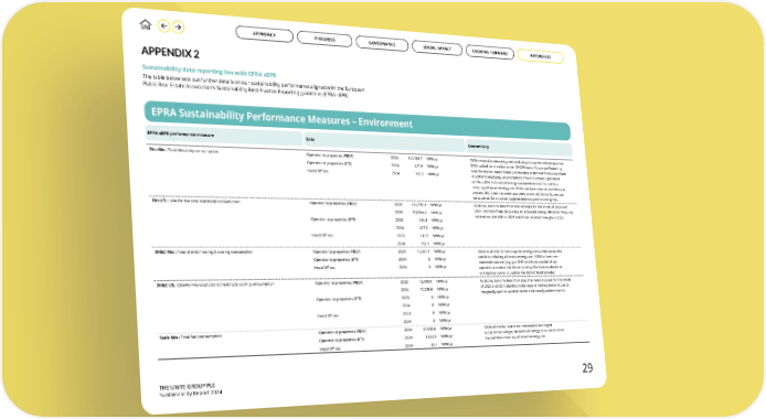 THE UNITE GROUP PLC Sustainability Report 2024 APPENDIX 2 EPRA sBPR performance measure Data Commentary Sustainability data reporting line with EPRA sBPR The table below sets out further details on our sustainability performance aligned with the European Public Real Estate Association’s Sustainability Best Practice Reporting guidelines (EPRA sBPR). Elec-Abs : Total electricity consumption Operational properties (PBSA) 2024: 144,144.7 MWh/yr 100% renewable electricity used with all grid supplied electricity either GOO backed (zero carbon under GHG Protocol Corporate Reporting rules for market-based Scope 2 emissions) or derived from a windfarm in Scotland supplying, via a corporate Power Purchase Agreement (cPPA), c.30%. Includes all energy consumed across the portfolio including all tenant energy use. Whilst we have solar photovoltaics at present, this is not metered separately so not additional figures can be supplied. Zero nuclear supplied electricity in the energy mix. Operational properties (BTR) 2024: 427.8 MWh/yr Head Offices 2024: 112.9 MWh/yr Elec-LfL : Like-for-like total electricity consumption Operational properties (PBSA) 2023: 142,755.3 MWh/yr As above, but only data from sites in scope for the whole of 2023 and 2024. Decrease from 2023 is due to increased energy efficiency measures installed on site both in 2024 and those installed throughout 2023. 2024: 139,049.3 MWh/yr Operational properties (BTR) 2023: 454.4 MWh/yr 2024: 427.8 MWh/yr Head Offices 2023: 112.9 MWh/yr 2024: 112.9 MWh/yr DH&C-Abs : Total district heating & cooling consumption Operational properties (PBSA) 2024: 10,261.1 MWh/yr Includes all district heat supplied energy consumed across the portfolio including all tenant energy use. 100% is from non- renewable sources (e.g. gas CHP) which are outside of our operational control. No district cooling. We have no details as to if nuclear power is used by the district head provider. Operational properties (BTR) 2024: 0 MWh/yr Head Offices 2024: 0 MWh/yr DH&C-LfL : Like-for-like total district heating & cooling consumption Operational properties (PBSA) 2023: 12,090.0 MWh/yr As above, but only data from sites that were in scope for the whole of 2023 and 2024. Significant decrease in heating demand due to marginally warmer weather in the traditionally colder months. 2024: 10,238.6 MWh/yr Operational properties (BTR) 2023: 0 MWh/yr 2024: 0 MWh/yr Head Offices 2023: 0 MWh/yr 2024: 0 MWh/yr Fuels-Abs : Total fuel consumption Operational properties (PBSA) 2024: 57,000.6 MWh/yr 100% of this fuel use is non-renewable and is grid supplied natural gas. Includes all energy consumed across the portfolio including all tenant energy use. Operational properties (BTR) 2024: 1,822.5 MWh/yr Head Offices 2024: 13.1 MWh/yr EPRA Sustainability Performance Measures – Environment 29 GOVERNANCE APPROACH PROGRESS SOCIAL IMPACT LOOKING FORWARD APPENDICES