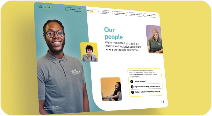 Our people We’re committed to creating a diverse and inclusive workplace where our people can thrive. THE UNITE GROUP PLC Sustainability Report 2024 GOVERNANCE APPROACH PROGRESS SOCIAL IMPACT LOOKING FORWARD APPENDICES One of our three strategic objectives is creating a Great Place to Work, which is centred around our three-part People Promise to create a platform where every employee can: Do their best work Experience a meaningful career journey Achieve extraordinary things together. 1 2 3 14 GOVERNANCE APPROACH SOCIAL IMPACT LOOKING FORWARD APPENDICES PROGRESS