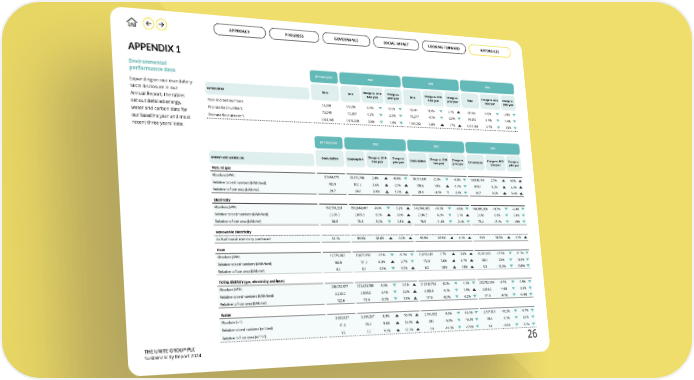 THE UNITE GROUP PLC Sustainability Report 2024 APPENDIX 1 Environmental performance data Expanding on our mandatory SECR disclosure in our Annual Report, the tables set out detailed energy, water and carbon data for our baseline year and most recent three years’ data. ESTATE DATA 2019 base year 2022 2023 2024 Change vs. 2019 base year Change vs. prior year Change vs. 2019 base year Change vs. prior year Change vs. 2019 base year Change vs. prior year Year-end bed numbers 73,990 69,290 -6.4% -9.0% 70,747 -4.4% 2.1% 68,068 -8.0% -3.8% Pro rata bed numbers 73,240 72,387 -1.2% -2.6% 70,277 -4.1% -2.9% 69,292 -5.4% -1.4% Pro rata floor area (m2) 1,931,148 1,915,339 -0.8% -1.6% 1,947,292 0.8% 1.7% 1,918,164 -0.7% -1.5% ENERGY AND WATER USE 2019 base year 2022 2023 2024 Change vs. 2019 base year Change vs. prior year Change vs. 2019 base year Change vs. prior year Change vs. 2019 base year Change vs. prior year Natural gas Absolute (kWh) 57,414,070 58,816,746 2.4% -0.6% 56,121,430 -2.3% -4.6% 58,836,198 2.5% 4.8% Relative to bed numbers (kWh/bed) 783.9 812.5 3.6% 2.0% 798.6 1.9% -1.7% 849.1 8.3% 6.3% Relative to floor area (kWh/m2) 29.7 30.7 3.3% 1.0% 28.8 -3.1% -6.1% 30.7 3.2% 6.4% Electricity Absolute (kWh) 167,593,224 150,944,907 -9.9% 1.2% 149,704,305 -10.7% -0.8% 144,685,326 -13.7% -3.4% Relative to bed numbers (kWh/bed) 2,288.3 2,085.5 -8.9% 3.8% 2,130.2 -6.9% 2.1% 2,088 -8.8% -2.0% Relative to floor area (kWh/m2) 86.8 78.8 -9.2% 2.8% 76.9 -11.4% -2.4% 75.4 -13.1% -1.9% Renewable electricity As % of overall electricity purchased 61.1% 99.9% 38.8% 0.0% 99.9% 38.9% 0.1% 99.9 38.9% 0.1% Heat Absolute (kWh) 11,775,682 11,672,055 -0.9% -5.2% 12,090,049 2.7% 3.6% 10,261,075 -12.9% -15.1% Relative to bed numbers (kWh/bed) 160.8 161.2 0.3% -2.7% 172.0 7.0% 6.7% 148.1 -7.9% -13.9% Relative to floor area (kWh/m2) 6.1 6.1 -0.1% 3.7% 6.2 1.8% 1.8% 5.3 -12.3% -13.8% TOTAL ENERGY (gas, electricity and heat) Absolute (kWh) 236,782,977 221,433,708 -6.5% 0.3% 217,915,784 -8.0% -1.6% 213,782,599 -9.7% -1.9% Relative to bed numbers (kWh/bed) 3,233.0 3,059.0 -5.4% 3.0% 3,100.8 -4.1% 1.4% 3,085.2 -4.6% -0.5% Relative to floor area (kWh/m2) 122.6 115.6 -5.7% 1.9% 111.9 -8.7% -3.2% 111.5 -9.1% -0.4% Water Absolute (m3) 3,037,827 3,291,267 8.3% 10.4% 2,746,922 -9.6% -16.5% 2,727,824 -10.2% -0.7% Relative to bed numbers (m3/bed) 41.5 45.5 9.6% 13.4% 39.1 -5.8% -14.1% 39.4 -5.1% 0.7% Relative to floor area (m3/m2) 1.6 1.7 9.2% 12.2% 1.4 -10.3% -17.0% 1.4 -9.6% 0.8% Data Consumption Consumption Consumption Consumption Data Data Data 26 GOVERNANCE APPROACH PROGRESS SOCIAL IMPACT LOOKING FORWARD APPENDICES