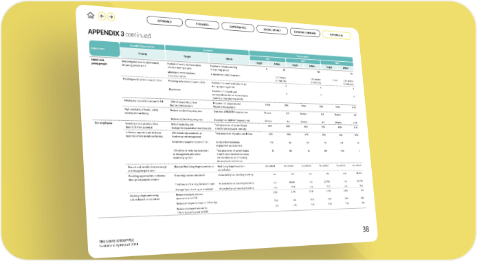 THE UNITE GROUP PLC Sustainability Report 2024 APPENDIX 3 continued Impact area Sustaiability priorities Ambition Performance Priority Target Metric 2022 2023 2024 Target Actual Target Actual Target Actual Students & young people Improving inclusion & achievement for young people in HE Number of new Unite Foundation scholars starting in year Number of scholars starting in reporting period 0 99 106 80 Maintain current donations Unite Foundation £ donated to Unite Foundation £1.7 million (£1,748,338) £1.8 million (£1,847,320) £1.8m £1.9 million (£1,886,966) Providing early careers opportunities Providing early careers opportunities Number of 3-month paid internships during reporting period 4 6 8 Placements Number of 12-month paid undergraduate industrial placements starting during reporting period 8 11 6 Helping our customers succeed in HE 100% of properties to have Resident Ambassadors Proportion of properties with Resident Ambassadors 100% 50% 100% 85% 100% 91% High standards of health, safety, security and wellbeing Reduce accident frequency rate Operational RIDDOR frequency rate Reduce 0.5 Reduce 0.3 Reduce 0.2 Reduce accident frequency rate Development RIDDOR frequency rate Reduce 4.6 Reduce 4.5 Reduce 3.7% Our employees Investing in our people to help them fulfil their potential 65% of leadership and management population hired internally Total proportion of current Grade A and B roles recruited internally 65% 60% 65% 75% 65% 81% A diverse, equitable and inclusive business where people can belong 40% female representation at leadership and management Total proportion of grade A and B roles 40% 30% 40% 28% 40% 37% Employee engagement score of 75+ As reported in employee engagement questionnaire >75 65 >75 70 >75 74 10% ethnic minority representation in management and senior leadership by 2025 Total proportion of current Grade A and B roles, based on voluntary self identification and including those who do not disclose 10 5% 10 8% 10% 7 Reward and benefits that encourage and recognise great work Maintain Real Living Wage accreditation Real Living Wage foundation accreditation Accredited Accredited Accredited Accredited Accredited Accredited Providing opportunities to develop throughout peoples’ careers E-learning courses completed As tracked by our Learning Academy n/a n/a n/a n/a n/a 36,322 Total hours of training delivered in year As tracked by our Learning Academy n/a 19,600 n/a 22,782 n/a 32,799 Average hours training per employee As tracked by our Learning Academy n/a 11.0 n/a 11.5 n/a 16.2 Creating a high performing culture based on our values Reduce employee sickness absence rate to 2.5% 2.5% 2.7% 2.5% 2.1% 2.5% 2.6 Reduce employee turnover to 35% in Ops 57% n/a 35% 32% 35% 28% Reduce employee turnover to 15% in Support by end of 2024 n/a n/a 15% 15% 15% 9% 38 GOVERNANCE APPROACH PROGRESS SOCIAL IMPACT LOOKING FORWARD APPENDICES