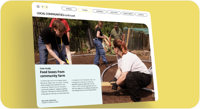 Case study Food boxes from community farm Our Bristol operation team is working with Bedminster Down Community Farm in Bristol which provides food boxes for the local community. They help to run free weekly community lunches for people facing food insecurity. The team volunteered their time to clear ground and put up a new polytunnel, increasing the farm’s food production and allowing them to donate a further five vegetable boxes per week. Plans for the project in 2025 include supporting the farm with the creation of a wildflower meadow and fundraising to improve electricity provision. LOCAL COMMUNITIES continued THE UNITE GROUP PLC Sustainability Report 2024 GOVERNANCE APPROACH PROGRESS SOCIAL IMPACT LOOKING FORWARD APPENDICES 13 GOVERNANCE APPROACH SOCIAL IMPACT LOOKING FORWARD APPENDICES PROGRESS