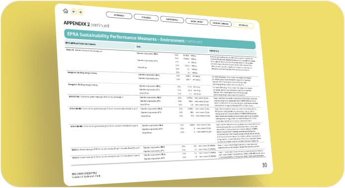 THE UNITE GROUP PLC Sustainability Report 2024 APPENDIX 2 continued Fuels-LfL : Like-for-like total fuel consumption Operational properties (PBSA) 2023: 56,108.4 MWh/yr As above, but including only data from sites that were in scope for the whole of 2023 and 2024. Marginal increase due to increased consumption at a number of sites and due to a heat pump failure. BTR the gas data was not in scope in the previous years, so only 2024 included. Head office is an estimate with no significant change in our premises and represents significantly less than 1% of our total consumption. 2024: 56,864.0 MWh/yr Operational properties (BTR) 2023: 0 MWh/yr 2024: 1,822.5 MWh/yr Head Offices 2023: 13.1 MWh/yr 2024: 13.1 MWh/yr Energy-Int : Building energy intensity Operational properties (PBSA) 2024: 3,085.2 kWh/bed/yr Sum total of Electricity + District Heat + Natural gas consumption per bed per year (pro rata treatment of acquisitions/ openings/ disposals). BTR is much higher in terms of energy usage due to energy being in sole control of the residents. Operational properties (BTR) 2024: 6,881.7 kWh/unit/yr Energy-Int : Building energy intensity Operational properties (PBSA) 2024: 111.5 kWh/m2/yr Sum total of Electricity + District Heat + Natural gas consumption per bed per year (pro rata treatment of acquisitions/ openings/ disposals). BTR is much higher in terms of energy usage due to energy being in sole control of the residents. Operational properties (BTR) 2024: 201.4 kWh/m2/yr Head Offices 2024: 11.1 kWh/m2/yr GHG-Dir-Abs : Total direct green house gas (GHG) emissions (Scope 1) Operational properties (PBSA) 2024: 10,578.3 metric tonnes CO2e/yr Scope 1 emissions, calculated in accordance with the GHG protocol and using natural gas consumption data and UK DEFRA/DESNZ emissions factors. Includes all emissions across the whole Unite Students portfolio including tenant energy use, heating for BTR and office heating. Operational properties (BTR) 2024: 333.3 metric tonnes CO2e/yr Head Offices 2024: 2.4 metric tonnes CO2e/yr GHG-Indir-Abs : Total indirect greenhouse gas (GHG) emissions (location-based Scope 2) Operational properties (PBSA) 2024: 31,688.6 metric tonnes CO2e/yr Scope 2 location-based emissions, calculated in accordance with the GHG protocol using grid electricity consumption data and district heating consumption data and relevant UK DEFRA/DESNZ emissions factor. Includes all emissions across the whole Unite Students portfolio including tenant energy use but not tenant electricity in BTR as this is separately metered and outside our operational control. Operational properties (BTR) 2024: 88.6 metric tonnes CO2e/yr Head Offices 2024: 23.4 metric tonnes CO2e/yr GHG-Indir-Abs : Total indirect greenhouse gas (GHG) emissions (market-based Scope 2) Operational properties (PBSA) 2024: 1,866.8 metric tonnes CO2e/yr Scope 2 market-based emissions, calculated in accordance with the GHG protocol using supplier’s contractual emissions factor, consumption data and district heating consumption data and relevant UK DEFRA/ DESNZ emissions factor. Electricity across the portfolio has zero emission factor as 100% renewable energy certificate backed. Includes all emissions across the whole Unite Students portfolio including tenant energy use but not tenant electricity in BTR as this is separately metered and outside our operational control therefore Scope 3 category 13. Operational properties (BTR) 2024: 0 metric tonnes CO2e/yr Head Offices 2024: 0 metric tonnes CO2e/yr GHG-Int : Greenhouse gas (GHG) emissions intensity (Scope 1 + location-based Scope 2) Operational properties (PBSA) 2024: 0.6 metric tonnes CO2e/bed/yr Scope 1 + location-based Scope 2 emissions, as described above divided by total number of beds in the portfolio both PBSA and BTR. Operational properties (BTR) 2024: 1.3 metric tonnes CO2e/bed/yr GHG-Int : Greenhouse gas (GHG) emissions intensity (Scope 1 + market-based Scope 2) Operational properties (PBSA) 2024: 0.2 metric tonnes CO2e/bed/yr Scope 1 + market-based Scope 2 emissions, as described above, divided by total number of beds in the portfolio both PBSA and BTR. BTR remains high as it has a large proportion of energy use as Scope 1 natural gas consumption. Operational properties (BTR) 2024: 1.0 metric tonnes CO2e/bed/yr EPRA Sustainability Performance Measures – Environment continued EPRA sBPR performance measure Data Commentary 30 GOVERNANCE APPROACH PROGRESS SOCIAL IMPACT LOOKING FORWARD APPENDICES