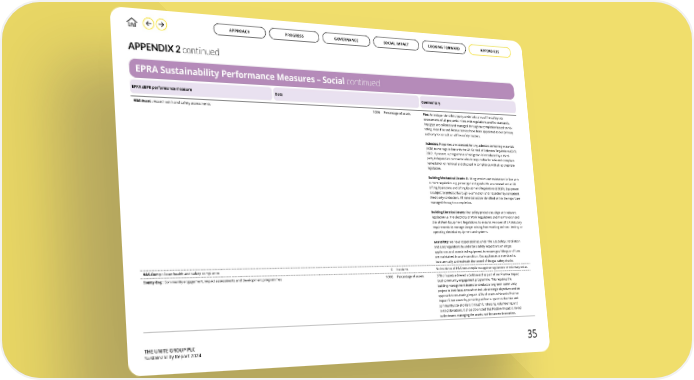 THE UNITE GROUP PLC Sustainability Report 2024 APPENDIX 2 continued EPRA Sustainability Performance Measures – Social continued H&S-Asset : Asset health and safety assessments 100% Percentage of assets Fire: An independent third-party undertake annual fire safety risk assessments of all propertis in line with regulations and fire standards. Any gaps are collated and managed through to completion based on risk rating. Avon Fire and Rescue service have been appointed as our primary authority to consult on all fire safety matters. Asbestos: Properties are assessed for any asbestos containing materials (ACM) to manage in line with the UK Control of Asbestos Regulations (CAR) 2012. If present, a programme of mitigation is introduced by a third- party independent contractor who is responsible for safe and compliant remediation or removal and disposal in compliance with all appropriate legislation. Building Mechanical Assets: Building services are maintained in line with current regulation. e.g. passenger and goods lifts are covered under UK Lifting Operations and Lifting Equipment Regulations (LOLER). Equipment is subject to periodic thorough examination and inspection by competent third-party contractors. All remedial action identified within the report are managed through to completion. Building Electrical Assets: Our safety procedures align with relevant legislation i.e. The Electricity at Work Regulations and The Provision and Use of Work Equipment Regulations, to ensures we cover all UK statutory requirements to manage danger arising from working on/near, testing, or operating electrical equipment and systems. Gas safety: We have responsibilities under the Gas Safety (Installation and Use) regulations to undertake safety inspections on all gas appliances and associated equipment, to ensure gas fittings and flues are maintained in a safe condition. Gas appliances are serviced at least annually and maintain the record of the gas safety checks. H&S-Comp : Asset health and safety compliance 0 Incidents No incidence of H&S non-compliance against regulations or voluntary codes. Comty-Eng : Community engagement, impact assessments and development programmes 100% Percentage of assets 57% of assets achieved a Gold award as part of our Positive Impact local community engagement programme. This requires the building management teams to conduct a long-term community project in their local area which include strategic objectives and an approach to measuring impact. 43% of assets achieved a Positive Impact Silver award by providing ad hoc support to charities and community stakeholders through fundraising, volunteering and in-kind donations. It should be noted that Positive Impact is linked to the teams managing the assets, not the assets themselves. EPRA sBPR performance measure Data Commentary 35 GOVERNANCE APPROACH PROGRESS SOCIAL IMPACT LOOKING FORWARD APPENDICES