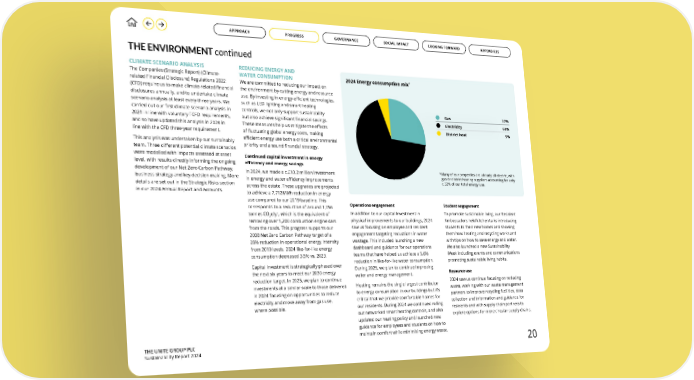 THE ENVIRONMENT continued THE UNITE GROUP PLC Sustainability Report 2024 CLIMATE SCENARIO ANALYSIS The Companies (Strategic Report) (Climate- related Financial Disclosure) Regulations 2022 (CFD) require us to make climate-related financial disclosures annually, and to undertake climate scenario analysis at least every three years. We carried out our first climate scenario analysis in 2021 in line with voluntary TCFD requirements, and so have updated this analysis in 2024 in line with the CFD three-year requirement. This analysis was undertaken by our sustainably team. Three different potential climate scenarios were modelled with impacts assessed at asset level, with results directly informing the ongoing development of our Net Zero Carbon Pathway, business strategy and key decision-making. More details are set out in the Strategic Risks section in our 2024 Annual Report and Accounts. REDUCING ENERGY AND WATER CONSUMPTION We are committed to reducing our impact on the environment by cutting energy and resource use. By investing in energy-efficient technologies, such as LED lighting and smart heating controls, we not only support sustainability but also achieve significant financial savings. These measures help us mitigate the effects of fluctuating global energy costs, making efficient energy use both a critical environmental priority and a sound financial strategy. Continued capital investment in energy efficiency and energy savings In 2024, we made a c.£10.2 million investment in energy and water efficiency improvements across the estate. These upgrades are projected to achieve a 7,712MWh reduction in energy use compared to our 2019 baseline. This corresponds to a reduction of around 1,756 tonnes CO2e/yr, which is the equivalent of removing over 1,200 combustion engine cars from the roads. This progress supports our 2030 Net Zero Carbon Pathway target of a 28% reduction in operational energy intensity from 2019 levels. 2024 like-for-like energy consumption decreased 3.5% vs. 2023. Capital investment is strategically phased over the next six years to meet our 2030 energy reduction target. In 2025, we plan to continue investments at a similar scale to those delivered in 2024 focusing on opportunities to reduce electricity and move away from gas use, where possible. GOVERNANCE APPROACH PROGRESS SOCIAL IMPACT LOOKING FORWARD APPENDICES Gas 27% Electricity 68% District heat 5% * Many of our properties are already all-electric, with gas or district heating suppliers accounting for only c.32% of our total energy use. Operations engagement In addition to our capital investment in physical improvements to our buildings, 2024 saw us focusing on employee and resident engagement targeting reductions in water wastage. This included launching a new dashboard and guidance for our operations teams that have helped us achieve a 5.6% reduction in like-for-like water consumption. During 2025, we plan to continue improving water and energy management. Heating remains the single largest contributor to energy consumption in our buildings but it’s critical that we provide comfortable homes for our residents. During 2024 we continued rolling out networked smart heating controls, and also updated our heating policy and launched new guidance for employees and students on how to maintain comfort while minimising energy waste. 2024 Energy consumption mix* Student engagement To promote sustainable living, our Resident Ambassadors held kitchen talks introducing students to their new homes and showing them how heating and recycling works and with tips on how to save energy and water. We also launched a new Sustainability Week including events and communications promoting sustainable living habits. Resource use 2024 saw us continue focusing on reducing waste, working with our waste management partners to improve recycling facilities, data collection and information and guidance for residents and with supply chain partners to explore options for more circular supply chains. 20 GOVERNANCE APPROACH SOCIAL IMPACT LOOKING FORWARD APPENDICES PROGRESS
