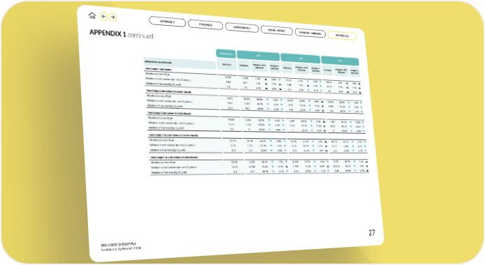 THE UNITE GROUP PLC Sustainability Report 2024 APPENDIX 1 continued GREENHOUSE GAS EMISSIONS 2019 base year 2022 2023 2024 Change vs. 2019 base year Change vs. prior year Change vs. 2019 base year Change vs. prior year Change vs. 2019 base year Change vs. prior year Total Scope 1 emissions Absolute (tonnes CO2e) 10,669 10,905 2.2% -0.9% 10,410 -2.4% -4.5% 10,914 2.3% 4.8% Relative to bed numbers (tonnes CO2e/bed) 0.146 0.151 3.4% 1.7% 0.148 1.7% -1.7% 0.158 8.1% 6.3% Relative to floor area (kg CO2e/m2) 5.5 5.7 3.1% 0.6% 5.3 -3.2% -6.1% 5.7 3.0% 6.4% Total Scope 2 emissions (location-based) Absolute (tonnes CO2e) 44,910 31,204 -30.5% -7.6% 33,172 -26.1% 6.3% 31,800 -29.2% -4.1% Relative to bed numbers (tonnes CO2e/bed) 0.613 0.431 -29.7% -5.2% 0.472 -23.0% 9.5% 0.459 -25.2% -2.8% Relative to floor area (kg CO2e/m2) 23.3 16.3 -29.9% -6.2% 17.0 -26.7% 4.6% 16.6 -28.7% -2.7% Total Scope 2 emissions (market-based) Absolute (tonnes CO2e) 18,833 2,052 -89.1% -5.4% 2,218 -88.2% 8.1% 1,867 -90.1% -15.8% Relative to bed numbers (tonnes CO2e/bed) 0.257 0.028 -89.0% -2.9% 0.032 -87.7% 11.3% 0.027 -89.5% -14.6% Relative to floor area (kg CO2e/m2) 9.8 1.1 -89.0% -3.9% 1.1 -88.3% 6.3% 1.0 -90.0% -14.6% Total Scope 1 & 2 emissions (location-based) Absolute (tonnes CO2e) 55,579 42,110 -24.2% -6.0% 43,582 -21.6% 3.5% 42,715 -23.1% -2.0% Relative to bed numbers (tonnes CO2e/bed) 0.759 0.582 -23.3% -3.5% 0.620 -18.3% 6.6% 0.616 -18.8% -0.6% Relative to floor area (kg CO2e/m2) 28.8 22.0 -23.6% -4.5% 22.4 -22.2% 1.8% 22.3 -22.6% -0.5% Total Scope 1 & 2 emissions (market-based) Absolute (tonnes CO2e) 29,502 12,958 -56.1% -1.7% 12,628 -57.2% -2.5% 12,781 -56.7% 1.2% Relative to bed numbers (tonnes CO2e/bed) 0.4028 0.1790 -55.6% 0.9% 0.1797 -55.4% 0.4% 0.1844 -54.2% 2.6% Relative to floor area (kg CO2e/m2) 15.3 6.77 -55.7% -0.1% 6.48 -57.6% -4.1% 6.66 -56.4% 2.7% Emissions Emissions Emissions Emissions 27 GOVERNANCE APPROACH PROGRESS SOCIAL IMPACT LOOKING FORWARD APPENDICES