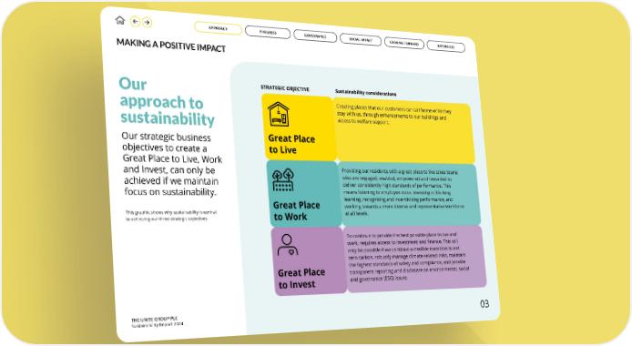 THE UNITE GROUP PLC Sustainability Report 2024 MAKING A POSITIVE IMPACT Our strategic business objectives to create a Great Place to Live, Work and Invest, can only be achieved if we maintain focus on sustainability. Our approach to sustainability This graphic shows why sustainability is central to achieving our three strategic objectives. GOVERNANCE APPROACH PROGRESS SOCIAL IMPACT LOOKING FORWARD APPENDICES Great Place to Work Providing our residents with a great place to live takes teams who are engaged, enabled, empowered and rewarded to deliver consistently high standards of performance. This means listening to employee voice, investing in life-long learning, recognising and incentivising performance, and working towards a more diverse and representative workforce at all levels. Great Place to Invest To continue to provide the best possible place to live and work, requires access to investment and finance. This will only be possible if we continue a credible transition to net zero carbon, robustly manage climate-related risks, maintain the highest standards of safety and compliance, and provide transparent reporting and disclosure on environmental, social and governance (ESG) issues. Creating places that our customers can call home while they stay with us, through enhancements to our buildings and access to welfare support. Great Place to Live 03 STRATEGIC OBJECTIVE Sustainability considerations GOVERNANCE PROGRESS SOCIAL IMPACT LOOKING FORWARD APPENDICES APPROACH
