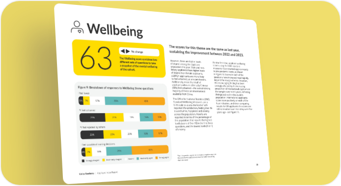 Wellbeing The scores for this theme are the same as last year, No change sustaining the improvement between 2022 and 2023. The Wellbeing score combines two However, there are higher levels For the first time, applicant wellbeing different sets of questions to take of shame among the applicant scores using the ONS standard a snapshot of the mental wellbeing population this year. Male and non- measures have returned approximately 63of the cohort. binary applicants have higher levels to pre-pandemic levels, as shown of shame than female applicants. in Figure 10. Scores in each of the LGBTQ+ applicants are more likely questions have increased meaningfully, to feel ashamed, as are care leavers. beyond the margin of error. However, Additionally, more than half of this encouraging finding has been applicants who are ethnically Chinese strongly affected by the increasing (58%) feel ashamed – the overwhelming proportion of international applicants in Figure 9: Breakdown of responses to Wellbeing theme ques琀椀ons majority of these are international the sample over recent years, reflecting I feel loved students from China. their growth within the student The Office for National Statistics (ONS) population. International applicants 5% 7% 17% 25% 45% Standard Wellbeing Measures use a score more positively on each of the 0-10 scale to assess the level of self- four indicators, and when comparing reported life satisfaction, feeling that life results for UK applicants the scores are *I feel ashamed is worthwhile, happiness and anxiety still somewhat lower than they were five across the population. Results are years ago - see Figure 11. 29% 21% 19% 16% 15% reported in terms of the percentage of the population that reports the highest levels (score of 9 or 10) in the first three *I feel rejected by others questions, and the lowest levels (0 or 1) of anxiety. 25% 20% 20% 18% 17% I feel capable of making decisions 4% 7% 16% 29% 44% Strongly disagree Moderately disagree Neutral Moderately agree Strongly agree *For this question, agreement indicates a negative response; the score for this question was reversed when calculating the index score Unite Students | Applicant Index Report 23
