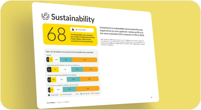 Sustainability Commitment to sustainability has increased this year, Up 1 from 2023 largely driven by more applicants making sacrifices to live more sustainably (53% compared to 48% in 2023). The Sustainability score measures the strength of feeling about climate change together with personal Male applicants (58%) and applicants over 21 (64%) are more likely to agree with 68commitment to living sustainably. this statement, as are international applicants (70%). Apart from these differences, applicants from different backgrounds are united in their largely positive attitude towards sustainability. Figure 21: Breakdown of responses to Sustainability theme ques琀椀ons I recycle 5% 7% 13% 24% 51% I have made sacrifices so that I can live more sustainably 8% 14% 24% 23% 30% I am careful about my use of water and electricity 6% 10% 20% 26% 38% It is extremely important to address climate change 4% 6% 17% 26% 48% Strongly disagree Moderately disagree Neutral Moderately agree Strongly agree Unite Students | Applicant Index Report 35