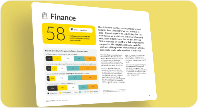 Finance Overall, financial confidence among this year’s cohort Down 1 from 2023 is slightly down compared to last year, and equal to 2022 – the early stages of the cost of living crisis. The The Finance score indicates the main changes are in relation to confidence in budgeting 58level of confidence in financial skills, which is slightly lower than last year. This year means and skills. 58% of applicants are confident in their budgeting skills compared to 63% last year. Additionally, two in five applicants (40%) agree that financial issues are affecting their mental health, an increase from 37% last year. Figure 1: Breakdown of responses to Finance theme ques琀椀ons I will have enough money to cover my costs at university International applicants are significantly issues are affecting their mental health. more confident in their level of funds, Additionally, 45% of applicants who 13% 17% 25% 22% 24% family support and budgeting skills than have qualified for free school meals say UK applicants, and yet they are also that financial issues affect their mental more likely to say that financial issues health. I have family or friends that I would feel comfortable about asking for financial help if needed are affecting their mental health at 47%, Those who were applying for a degree compared to 38% among UK applicants. apprenticeship scored lower in this 10% 11% 19% 25% 36% Among UK applicants, there is no theme than those applying for a indication of a ‘squeezed middle’, as traditional degree. They were less likely I am confident that I can budget and manage my money whilst at university for each of the finance index questions to agree they have family and friends the higher the social-economic group, they could turn to, and less confident the higher the confidence in financial in their budgeting skills. 6% 11% 24% 28% 30% support and sufficiency of funds. Similarly, those in socioeconomic groups C2 and D are significantly more likely *Financial issues are affecting my mental health than A-C1 groups to agree that financial 19% 19% 22% 20% 20% Strongly disagree Moderately disagree Neutral Moderately agree Strongly agree *For this question, agreement indicates a negative response; the score for this question was reversed when calculating the index score Unite Students | Applicant Index Report 13