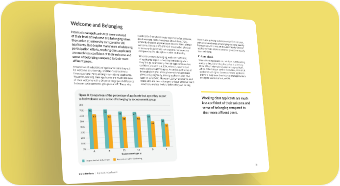 Welcome and Belonging International applicants feel more assured qualified for free school meals expected to feel welcome There is also a strong socioeconomic effect here too, of their level of welcome and belonging when at a lower rate (60%) than those who did not (70%). with anticipated sense of belonging declining steadily they arrive at university compared to UK Similarly, disabled applicants are less confident of their from group A to E. And yet the vast majority (80%) of welcome. Almost a fifth (18%) of those with a physical applicants from all socioeconomic groups are equally applicants. But despite many years of widening or sensory disability did not expect to feel welcome keen to belong. participation efforts, working class applicants compared to 6% of applicants with no disability. Culture shock are much less confident of their welcome and When it comes to belonging, well over half (58%) International applicants are not alone in anticipating sense of belonging compared to their more of applicants expect to feel like they belong when a culture shock when they first arrive at university. affluent peers. they first go to university. Female applicants are less While 57% of international applicants agree that it confident about this at 52%, whereas two thirds of will be difficult to get used to the culture, 46% of UK Around two thirds (68%) of applicants think they will male applicants (67%) agree. An anticipated sense of applicants also agree. Care experienced applicants be welcome at university, and this rises to almost belonging is higher among international applicants are more likely even than international applicants to three quarters (73%) among international applicants. (69%) and, poignantly, among applicants who have anticipate a culture shock, at 63%. However, working class applicants are much less sure been in care (64%). However LGBTQ+ applicants, and of their welcome with a 20 percentage point difference those who are neurodivergent or have a mental health between socioeconomic groups A and E. Those who condition, are less likely to believe they will belong. Figure 8: Comparison of the percentage of applicants that agree they expect Working class applicants are much to feel welcome and a sense of belonging by socioeconomic group less confident of their welcome and 80% sense of belonging compared to 70% 73 72 their more affluent peers. 60% 68 67 63 62 62 50% 58 58 49 53 40% 44 30% 20% 10% 0% A B C1 C2 D E Socioeconomic group I expect that I will feel welcome I expect that I will feel like I belong Unite Students | Applicant Index Report 22