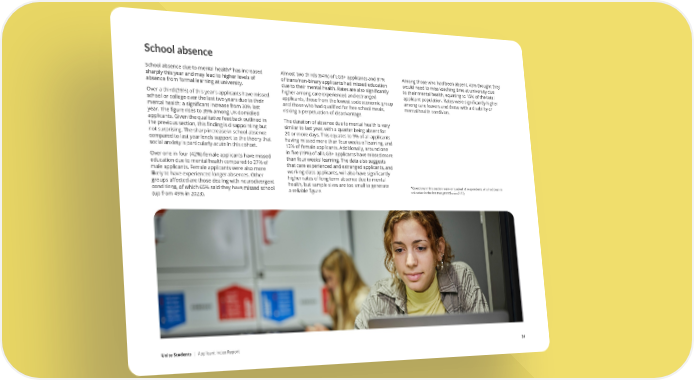 School absence School absence due to mental health* has increased Almost two thirds (64%) of LGB+ applicants and 81% Among those who had been absent, 43% thought they sharply this year and may lead to higher levels of of trans/non-binary applicants had missed education would need to miss teaching time at university due absence from formal learning at university. due to their mental health. Rates are also significantly to their mental health, equating to 15% of the total Over a third (36%) of this year’s applicants have missed higher among care experienced and estranged applicant population. Rates were significantly higher school or college over the last two years due to their applicants, those from the lowest socioeconomic group among care leavers and those with a disability or mental health; a significant increase from 30% last and those who had qualified for free school meals, mental health condition. year. The figure rises to 39% among UK domiciled risking a perpetuation of disadvantage. applicants. Given the qualitative feedback outlined in The duration of absence due to mental health is very the previous section, this finding is disappointing but similar to last year, with a quarter being absent for not surprising. The sharp increase in school absence 20 or more days. This equates to 9% of all applicants compared to last year lends support to the theory that having missed more than four weeks of learning, and social anxiety is particularly acute in this cohort. 12% of female applicants. Additionally, around one Over one in four (42%) female applicants have missed in five (19%) of all LGB+ applicants have missed more education due to mental health compared to 27% of than four weeks’ learning. The data also suggests male applicants. Female applicants were also more that care experienced and estranged applicants, and likely to have experienced longer absences. Other working class applicants, will also have significantly groups affected are those dealing with neurodivergent higher rates of long term absence due to mental conditions, of which 65% said they have missed school health, but sample sizes are too small to generate *Questions in this section were only asked of respondents who had been in (up from 49% in 2023). a reliable figure. education in the last two years (base=2132) Unite Students | Applicant Index Report 31