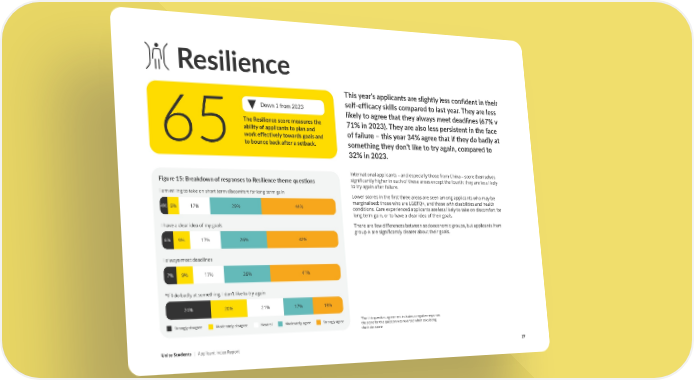 Resilience This year’s applicants are slightly less confident in their Down 1 from 2023 self-efficacy skills compared to last year. They are less likely to agree that they always meet deadlines (67% v The Resilience score measures the ability of applicants to plan and 71% in 2023). They are also less persistent in the face 65work effectively towards goals and of failure – this year 34% agree that if they do badly at to bounce back after a setback. something they don’t like to try again, compared to 32% in 2023. International applicants – and especially those from China – score themselves significantly higher in each of these areas except the fourth: they are less likely Figure 15: Breakdown of responses to Resilience theme ques琀椀ons to try again after failure. I am willing to take on short term discomfort for long term gain Lower scores in the first three areas are seen among applicants who may be 4% 6% 17% 29% 44% marginalised: those who are LGBTQ+, and those with disabilities and health conditions. Care experienced applicants are less likely to take on discomfort for long term gain, or to have a clear idea of their goals. I have a clear idea of my goals There are few differences between socioeconomic groups, but applicants from group A are significantly clearer about their goals. 6% 9% 17% 26% 42% I always meet deadlines 7% 9% 17% 26% 41% *If I do badly at something, I don’t like to try again 24% 20% 21% 17% 18% Strongly disagree Moderately disagree Neutral Moderately agree Strongly agree *For this question, agreement indicates a negative response; the score for this question was reversed when calculating the index score Unite Students | Applicant Index Report 27