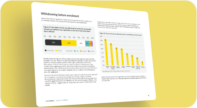 Withdrawing before enrolment About a third (32%) of applicants think it likely that they will not take up their place Respondents were able to choose multiple reasons from a list, including an ‘other’ at university, however the majority of these only think it ‘somewhat likely’. option. Financial issues are the most common reason closely followed by not achieving the required grades. However, lack of confidence, mental ill-health and homesickness were also significant. Figure 24: How likely is it that you will not go to university, for example because you withdraw your applica琀椀on or you don’t take up the place Figure 25: If you don’t go to university, what is most likely to be the reason? that is o昀昀ered? 35% 0% 10% 20% 30% 40% 50% 60% 70% 80% 90% 100% 30% 32 33% 32% 19% 9% 4 4 25% 27 20% 22 21 Not at all likely Not likely Somewhat likely Likely Very likely Don’t know 15% 15 13 10% 10 Broadly, these feelings are more prevalent among male applicants and those who are aged 19 or over. There is no significant difference between UK and international 5% applicants, though applicants who are ethnically Chinese (85% of which are 5 international students from China) are much less likely to think they won’t take 0% up their place, suggesting a higher level of uncertainty among other international Financial Not achieving Lack of Mental Homesickness Physical Stories about Other / student groups. These feelings are also more prevalent among care experienced and issues the grades confidence ill-health ill-health university don’t know estranged applicants, those with a disability, health condition or neurodivergence, you need in the media and LGB+ applicants. Base: Applicants who think it likely that they will not go to university (704) Data from the UCAS 2023 End of Cycle report shows that 26% of last year’s applicants were not placed, so we know not all applicants end up in higher education. Mental ill-health was the most significant concern for applicants with a disability or Nonetheless, it is impossible to infer how many of those who think they might drop mental health condition, neurodivergent applicants, estranged applicants and those out of the applicant process will indeed do so. The overall strength of feeling – only who are LGB+. ‘somewhat likely’ – suggests that, for many, these are concerns rather than strong doubts. Unite Students | Applicant Index Report 39