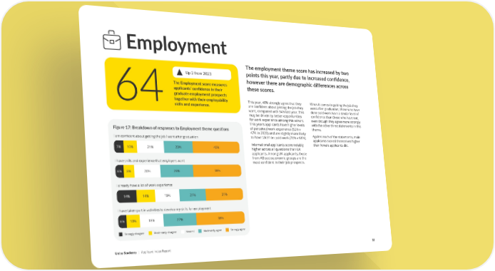 Employment The employment theme score has increased by two Up 2 from 2023 points this year, partly due to increased confidence, The Employment score measures however there are demographic differences across applicants’ confidence in their these scores. graduate employment prospects 64together with their employability This year, 40% strongly agree that they When it comes to getting the job they skills and experience. are confident about getting the job they want after graduation, those who have want, compared with 34% last year. This done paid work have a similar level of may be driven by better opportunities confidence than those who have not, for work experience among this cohort. even though they agree more strongly This year’s applicants have higher levels with the other three statements in this of perceived work experience (52% v theme. Figure 17: Breakdown of responses to Employment theme ques琀椀ons 47% in 2023) and are slightly more likely I am confident about getting the job I want after graduation to have taken on paid work (70% v 68%). Against each of the statements, male applicants scored themselves higher 7% 10% 21% 23% 40% International applicants score notably than female applicants did. higher across all questions than UK applicants. Among UK applicants, those I have skills and experience that employers want from AB socioeconomic groups are the most confident in their job prospects. 6% 8% 20% 26% 39% I already have a lot of work experience 14% 14% 19% 21% 31% I have taken part in activities to develop my skills for employment 6% 10% 18% 27% 39% Strongly disagree Moderately disagree Neutral Moderately agree Strongly agree Unite Students | Applicant Index Report 32