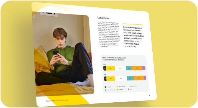 Loneliness Levels of loneliness among applicants seem to be more polarised this year. More applicants are lonely all or most For this year’s applicants, of the time (26% compared to 24% in loneliness tends to co- 2023) but at the same time more are rarely or never lonely this year (34% exist with disadvantage: compared to 31% in 2023). For this year’s applicants, loneliness tends to applicants with a disability co-exist with disadvantage: applicants or health condition are with a disability or health condition are considerably more likely to be always considerably more or often lonely (43%) and loneliness increases dramatically between likely to be always socioeconomic group A (22%) and or often lonely. group E (54%). Figure 6: How o昀琀en do you feel lonely? Comparison of 2023 and 2024 data 2024 6% 20% 26% 14% 25% 9% 2023 5% 19% 29% 16% 25% 6% All the time Most of the time At least once a week At least once a month Only rarely Never Unite Students | Applicant Index Report 20
