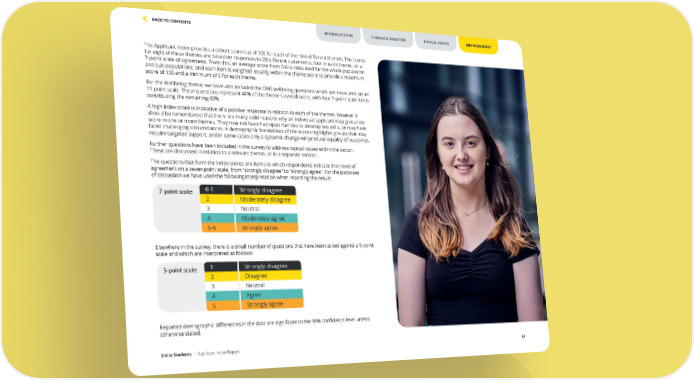 The Applicant Index provides a cohort score out of 100 for each of the nine different themes. The scores for eight of these themes are based on responses to 28 different statements, four in each theme, on a 7-point scale of agreement. From this, an average score from 0-6 is calculated for the whole population and sub-populations, and each item is weighted equally within the theme score to provide a maximum score of 100 and a minimum of 0 for each theme. For the Wellbeing theme, we have also included the ONS wellbeing questions which are measured on an 11 point scale. These questions represent 40% of the theme’s overall score, with four 7-point scale items contributing the remaining 60%. A high index score is indicative of a positive response in relation to each of the themes, however it should be remembered that there are many valid reasons why an individual applicant may give a low score in one or more themes. They may not have had opportunities to develop key skills, or may have faced challenging circumstances. A demographic breakdown of the scores highlights groups that may require targeted support, and in some cases only a systemic change will produce equality of outcomes. Further questions have been included in the survey to address topical issues within the sector. These are discussed in relation to a relevant theme, or in a separate section. The questions that form the index scores are items to which respondents indicate their level of agreement on a seven-point scale, from “strongly disagree” to “strongly agree”. For the purposes of discussion we have used the following interpretation when reporting the result: Elsewhere in the survey, there is a small number of questions that have been asked against a 5-point scale and which are interpreted as follows: Reported demographic differences in the data are significant to the 99% confidence level unless otherwise stated. 7-point scale: Strongly disagree 0-1 Moderately disagree 2 Neutral 3 Moderately agree 4 Strongly agree 5-6 5-point scale: Strongly disagree 1 Disagree 2 Neutral 3 Agree 4 Strongly agree 5 Unite Students | Applicant Index Report 41 INTRODUCTION THEMATIC ANALYSIS BACK TO CONTENTS METHODOLOGY TOPICAL ISSUES