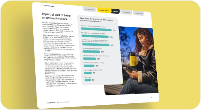 Impact of cost of living on university choice Last year we asked applicants to describe how the cost of living had affected their decisions about university. This year we quantified the main themes that arose, allowing for multiple selections, although in the event most respondents only selected one. Only a quarter (26%) are unaffected by the cost of living in their decisions about university. The most common responses are to choose different accommodation and to select a course or university that facilitates part-time work. However, some applicants feel restricted in terms of their course choice and location, with 10% not able to attend their top choice of university. International applicants are more likely to be unaffected in their choices (34%) compared to UK applicants (23%), with applicants from China being the least affected. Mature applicants are more likely to say they can’t attend their top choice of university, and to have restricted their course choices. Applicants with a disability are more likely to be affected in their choices and are more restricted geographically. Applicants who had qualified for free school meals are also facing greater restrictions or changes to their plans - they are more likely to say that they can’t attend their top choice of university (11%, compared to 7% who have not qualified for free school meals). THEMATIC ANALYSIS FINANCE Figure 4: How, if at all, has the cost of living affected your decisions about university? I will choose different student accommodation 29% 26% The cost of living has not affected my choices 26% I will choose a course/university that allows me to work part time around the timetable provided 16% I am more restricted geographically 12% I am more restricted in what course I can choose 10% I can’t attend my top choice university 7% I have changed my course choice 6% Don’t know Unite Students | Applicant Index Report 14 INTRODUCTION THEMATIC ANALYSIS FINANCE METHODOLOGY TOPICAL ISSUES BACK TO THEMES
