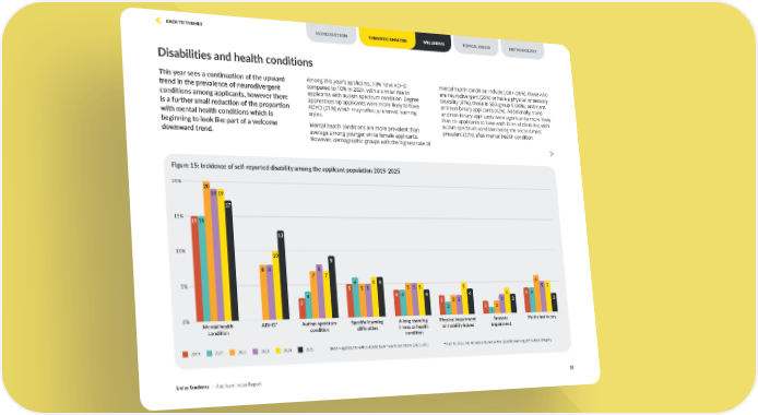 Disabilities and health conditions This year sees a continuation of the upward trend in the prevalence of neurodivergent conditions among applicants, however there is a further small reduction of the proportion with mental health conditions which is beginning to look like part of a welcome downward trend. Among this year’s applicants, 13% have ADHD compared to 10% in 2024, with a similar rise in applicants with autism spectrum condition. Degree apprenticeship applicants were more likely to have ADHD (21%) which may reflect preferred learning styles. Mental health conditions are more prevalent than average among younger white female applicants. However, demographic groups with the highest rate of mental health condition include LGB+ (38%), those who are neurodivergent (35%) or have a physical or sensory disability (37%), those in SEG group E (36%), and trans and non-binary applicants (42%). Additionally, trans and non-binary applicants were significantly more likely than cis applicants to have each form of disability, with autism spectrum condition being the second most prevalent (37%) after mental health condition. 20% 15% 10% 5% 0% Mental health condition Autism spectrum condition A long standing illness or health condition Physical impairment or mobility issues Sensory impairment Prefer not to say Specific learning difficulties ADHD* 15 17 13 9 3 3 3 3 3 3 2 2 1 2 3 5 5 5 5 5 5 5 5 6 5 15 8 4 4 4 4 4 4 4 4 6 6 6 7 7 8 8 10 19 19 20 2021 2022 2023 2024 2025 Figure 15: Incidence of self-reported disability among the applicant population 2019-2025 2019 Base = applicants with a disability or health condition (2025: 883) *Prior to 2022, ADHD was included in the Specific learning difficulties category Unite Students | Applicant Index Report 22 INTRODUCTION THEMATIC ANALYSIS WELLBEING METHODOLOGY TOPICAL ISSUES BACK TO THEMES