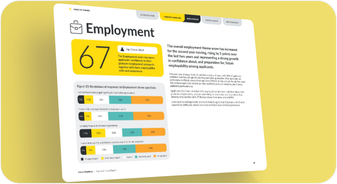 Employment I am confident about getting the job I want after graduation I have skills and experience that employers want I already have a lot of work experience I have taken part in activities to develop my skills for employment Strongly disagree Moderately disagree Neutral Moderately agree Strongly agree Figure 20: Breakdown of responses to Employment theme questions The Employment score measures applicants’ confidence in their graduate employment prospects together with their employability skills and experience. Up 3 from 2024 67 The overall employment theme score has increased for the second year running, rising by 5 points over the last two years and representing a strong growth in confidence about, and preparation for, future employability among applicants. This year sees stronger levels of confidence across all areas, with 60% of applicants confident that they will get the job they want after graduation. Male applicants are particularly confident; almost three quarters (73%) think they will get the job they want. International applicants tend to be more confident across all measures, and Chinese applicants particularly so. Applicants that have attended a fee-paying school are more confident about their graduate job prospects, and are more likely to have taken part in activities that develop employment skills (71%) than those from state school (63%). Care experienced applicants are more likely to agree that they have a lot of work experience (68%) and overall are more confident about their job prospects. 9% 16% 27% 43% 4% 10% 16% 25% 5% 45% 14% 19% 22% 33% 11% 9% 19% 24% 43% 5% Unite Students | Applicant Index Report 28 INTRODUCTION THEMATIC ANALYSIS EMPLOYMENT METHODOLOGY TOPICAL ISSUES BACK TO THEMES