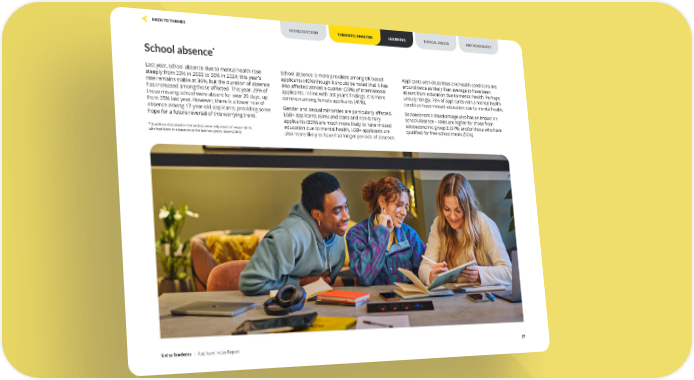 School absence* Last year, school absence due to mental health rose steeply from 30% in 2023 to 36% in 2024; this year’s rate remains stable at 36%, but the duration of absence has increased among those affected. This year, 29% of those missing school were absent for over 20 days, up from 25% last year. However, there is a lower rate of absence among 17-year-old applicants, providing some hope for a future reversal of this worrying trend. School absence is more prevalent among UK based applicants (40%) though it should be noted that it has also affected almost a quarter (23%) of international applicants. In line with last year’s findings, it is more common among female applicants (41%). Gender and sexual minorities are particularly affected. LGB+ applicants (64%) and trans and non-binary applicants (83%) are much more likely to have missed education due to mental health. LGB+ applicants are also more likely to have had longer periods of absence. Applicants with disabilities and health conditions are around twice as likely than average to have been absent from education due to mental health. Perhaps unsurprisingly, 78% of applicants with a mental health condition have missed education due to mental health. Socioeconomic disadvantage also has an impact on school absence – rates are higher for those from socioeconomic group E (57%) and/or those who have qualified for free school meals (52%). *Questions discussed in this section were only asked of respondents who had been in education in the last two years (base=2284)) Unite Students | Applicant Index Report 27 INTRODUCTION THEMATIC ANALYSIS LEARNING METHODOLOGY TOPICAL ISSUES BACK TO THEMES
