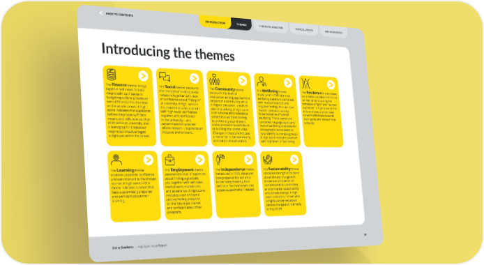 Introducing the themes The Finance theme brings together self-rated financial means with confidence in budgeting skills to provide an overall financial health check on the whole cohort. A high score indicates that applicants believe they have sufficient means and skills to meet their costs while at university, and a demographic breakdown may reveal disadvantaged subgroups within the cohort. The Learning theme assesses academic confidence and commitment to the chosen course. A high score in this theme indicates a cohort that feels academically prepared and confident about their learning. The Social theme measures the strength of existing social networks together with level of confidence about “fitting in” at university. A high score in this theme indicates a cohort with high social confidence together with confidence in the university – and accommodation provider where relevant – to provide an inclusive environment. The Employment theme assesses the level of optimism about finding a graduate job, together with self-rated level of work-related skills and experience. A high score indicates a cohort that is already feeling prepared for the future job market and confident about their prospects. The Community theme measures the level of motivation among applicants to be part of a community while in higher education, and their desire to belong. A high score in this theme also indicates a cohort that wants to belong to a diverse group of peers and is prepared to contribute to building that community. Changes in the score indicate a rise or fall in the community orientation of each cohort. The Independence theme, introduced in 2023, measures how prepared the cohort is to live independently, take decisions for themselves and access support when needed. The Wellbeing theme draws on the ONS standard wellbeing questions combined with levels of positive and negative feelings that we have found in previous surveys to be indicative of overall wellbeing. These scores are combined to gauge applicants’ level of wellbeing and allow for demographic breakdown to help identify vulnerable groups. A high score indicates a cohort with high levels of wellbeing. The Sustainability theme combines strength of concern about climate change with behaviours and personal commitments to addressing environmental sustainability and climate change. A high score indicates a cohort who is highly concerned about climate change and is already taking action. The Resilience theme draws on previous academic research on resilience including the concepts of “grit” and “learned optimism”. A high score in this theme shows a cohort able to work effectively towards clear goals and recover from setbacks. THEMES Unite Students | Applicant Index Report 10 INTRODUCTION THEMATIC ANALYSIS METHODOLOGY TOPICAL ISSUES BACK TO CONTENTS