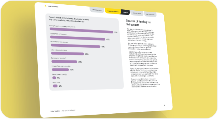 Sources of funding for living costs This year, multiple selections were allowed for the first time which provides a clearer picture of the sources of funding that applicants intend to use to meet their living costs, however it does mean that the data is not directly comparable with previous years. On average, applicants selected two sources of funding. Just over half of applicants intend to draw on family support, rising to 70% among international applicants. Around half of UK applicants intended to use the maintenance loan. Expected income from employment was relatively high at 45%, but much lower than the proportion of applicants who indicated that they intended to work during term time, suggesting some uncertainty about term-time employment. State school applicants were more likely to draw on income from employment and maintenance loans/grants compared with their peers. Among UK applicants, 25% intend to live at home with their family. This has risen notably among socioeconomic groups AB, from 18% to 22%. Among those who have qualified for free school meals 29% are planning to live at home. Those who intended to live in university or privately run halls were more likely to rely on family support than those who intended to live at home, which underlines the importance of the role of parents in student accommodation. THEMATIC ANALYSIS FINANCE Figure 5: Which of the following do you plan to use to help cover your living costs while at university? Family support e.g. money from parents 53% 45% Income from employment 40% Maintenance loan or grant 26% Scholarship/studentship 20% Bank loan or overdraft 13% Income from apprenticeship 1% Other (please specify) 2% Don’t know Unite Students | Applicant Index Report 15 INTRODUCTION THEMATIC ANALYSIS FINANCE METHODOLOGY TOPICAL ISSUES BACK TO THEMES