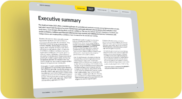 Executive summary The Applicant Index 2025 offers a tantalising glimpse of a potential post-pandemic recovery among higher education entrants. Last year’s report told the story of a cohort that had been particularly affected by the lockdowns which took place in their early teens, most strongly affecting their academic confidence. This year, by contrast, last year’s downturns in academic and social confidence, resilience and financial wellbeing have been reversed, and wellbeing has improved. Furthermore, both independence and employability confidence have increased for the second year running. However, this optimism does come with a caveat. International applicants are more confident in almost every area than their UK counterparts. They have better overall wellbeing and are less likely to have a disability, neurodivergent condition or mental health condition. Of course, much of this will be due to a self-selection effect – it takes a lot of confidence, resilience and financial backing to contemplate enrolling on a three-year course in a different country. Nonetheless, these differences are worthy of consideration in the practical sense of planning for student support needs, and they may be especially pertinent for institutions who have had to change their recruitment strategies rapidly in favour of UK applicants over recent years. Once again, this year’s survey demonstrates that some applicants are approaching higher education with significant and wide-ranging disadvantages. For example, LGBTQ+ applicants, and/or those who are neurodivergent are disadvantaged in multiple areas, especially in relation to social and wellbeing factors, but also affecting financial and learning confidence. Additionally, half of LGB+ applicants, 63% of trans and non-binary applicants and 47% of neurodivergent applicants agree that after doing badly at something they don’t like to try again, compared to an overall cohort average of 36%. In the light of the recently published Compassionate Communication Statement1, these findings provide a context that helps both to review and to implement inclusive strategies and policies. These, and other findings relating to disadvantaged demographics, may be particularly relevant to personal tutors and academic advisors. Over the last three years, the Applicant Index has measured the proportion of applicants who have missed education due to their mental health: between 2023 and 2024 this rose sharply from 30% to 36%. Perhaps reassuringly, there has been no rise this year, though the prevalence remains high at 36% and there has been a rise in those who have had a longer period of absence. Many of those whose mental health has affected their prior learning also have, understandably, lower confidence about their ability to study in higher education. This may be a consideration for those planning transition to higher education and the first-year experience, as it suggests the need for targeted support. A feature of this year’s survey is a new set of questions about artificial intelligence (AI) and social media. One in four applicants have been negatively affected by social media, rising to over half among disabled applicants. Additionally, almost a third of applicants are against the use of AI. International applicants are much more likely than those from the UK to have used AI to support their learning, and are more accepting of it in general. It is difficult to know what is behind the rejection of AI among many UK applicants. Further research may be needed to understand attitudes and use of AI among applicants and students or there is a risk that, as the technology matures, some students could be disadvantaged in terms of their learning. 1https://www.ntu.ac.uk/__data/assets/pdf_file/0030/2526771/ Compassionate-Communication-Statement.pdf EXECUTIVE SUMMARY Unite Students | Applicant Index Report 7 INTRODUCTION THEMATIC ANALYSIS METHODOLOGY TOPICAL ISSUES BACK TO CONTENTS