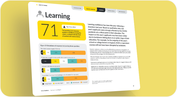 Learning *For this question, agreement indicates a negative response; the score for this question was reversed when calculating the index score My chosen course is a good fit for me *I think I will struggle to keep up with other students on my course I am sure I will complete my course I’m confident I can learn the knowledge and skills needed for my course Strongly disagree Moderately disagree Neutral Moderately agree Strongly agree Figure 19: Breakdown of responses to Learning theme questions The Learning score measures academic confidence among the cohort, combined with the level of comfort with course choice. 71 Learning confidence has risen this year, following a downturn last year. Based on qualitative data, last year’s applicants were strongly affected by the COVID pandemic at a critical point in their education. The impact on this year’s applicants may have been milder due to lockdowns taking place at an earlier stage of their education. For example, for the majority of this year’s school or college leavers in England, GCSE or equivalent courses will not have been disrupted by lockdown. 8% 13% 22% 4% 60% However, academic confidence can be affected by socioeconomic background. UK applicants from socioeconomic group A are most likely to strongly agree that they are confident they can learn the knowledge and skills needed for their course (36%) when compared to the average of all other groups (23%). International applicants have higher learning confidence in general compared to UK applicants, which is likely linked to the characteristics of applicants who choose to study overseas. Care experienced applicants are more likely to think they will struggle to keep up with others on their course (59% compared to 39%). Applicants with disabilities are also more likely to think they will struggle to keep up, and trans and non-binary applicants are at the highest risk (65%). These groups also express lower confidence in the other questions within this theme. 19% 19% 20% 21% 21% 4% 11% 19% 1% 65% 5% 11% 25% 2% 57% Up 2 from 2024 Unite Students | Applicant Index Report 26 INTRODUCTION THEMATIC ANALYSIS LEARNING METHODOLOGY TOPICAL ISSUES BACK TO THEMES