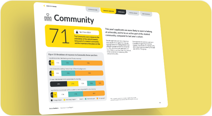 7% 17% 27% 4% Community Female applicants are more likely than male applicants to agree that they are looking forward to making friends from different backgrounds (84% compared to 78%), whereas male applicants are more likely to say they have little interest in the social side of university (35% compared to 28%). Care experienced applicants are much more likely to agree they have little interest in social side of university (51%), which may in part be driven by the older age profile of this group. I would like to feel like I belong when I’m at university 5% 11% 23% 58% I look forward to making friends from different backgrounds *I have little interest in the social side of university I want to be an active part of the student community while I’m at university Strongly disagree Moderately disagree Neutral Moderately agree Strongly agree Figure 10: Breakdown of responses to Community theme questions The Community score measures the orientation of the cohort towards being part of a student community, and the importance they place on this. 71 This year’s applicants are more likely to want to belong at university, and to be an active part of the student community, compared to last year’s cohort. 2% 4% 14% 25% 2% 56% 34% 21% 15% 15% 16% 46% Up 1 from 2024 *For this question, agreement indicates a negative response; the score for this question was reversed when calculating the index score Unite Students | Applicant Index Report 18 INTRODUCTION THEMATIC ANALYSIS COMMUNITY METHODOLOGY TOPICAL ISSUES BACK TO THEMES