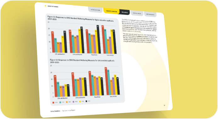 Figure 13: Responses to ONS Standard Wellbeing Measures for higher education applicants 2019-2025 Life satisfaction 25 20 15 10 5 0 18 13 10 10 15 19 Life worthwhile 20 16 15 16 21 23 Happiness 21 18 17 17 21 25 Low anxiety 25 22 14 16 22 22 2019 2021 2022 2023 2024 2025 The Office for National Statistics (ONS) Standard Wellbeing Measures use a 0-10 scale to assess the level of self-reported life satisfaction, feeling that life is worthwhile, happiness and anxiety across the population. Results are reported in terms of the percentage of the population that reports the highest levels (score of 9 or 10) in the first three questions, and the lowest levels (0 or 1) of anxiety. This year sees an overall return to – and improvement on – pre-pandemic levels of wellbeing. However, as was the case last year, this is largely driven by international applicants. Among UK applicants there has been no recovery from the changes seen during and just after the pandemic. Figure 14: Responses to ONS Standard Wellbeing Measures for UK domiciled applicants 2019-2025 Life satisfaction 25 20 15 10 5 0 18 13 10 10 11 11 Life worthwhile 20 15 15 16 16 16 Happiness 21 18 17 16 17 16 Low anxiety 24 22 14 16 18 16 Unite Students | Applicant Index Report 21 INTRODUCTION THEMATIC ANALYSIS WELLBEING METHODOLOGY TOPICAL ISSUES BACK TO THEMES