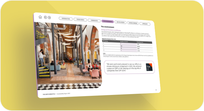 Energy performance certificates Over the last few years, we’ve made great progress on improving EPC ratings via a combination of capital investment, operational management changes, and improvements to the data quality and accuracy of information used to calculate EPCs. As a result, we are fully compliant with current EPC Minimum Energy Efficiency Standards (MEES) of E or higher that took effect in 2023, and on track to meet future targets of a C from 2028 and B from 2030. 2025 EPC Ratings by floor area THE UNITE GROUP PLC | Sustainability Report 2025 21 The environment EPC Rating Number of assets % by floor area A 3 5.8% B 155 85.4% C 23 8.4% D 7 0.1% ESOS We have complied with the requirements of the Energy Saving Opportunity Scheme (ESOS) Phase 4 and have published our annual report via the Government’s MESOS online platform. INTRODUCTION YOUNG PEOPLE COMMUNITIES OUR COLLEAGUES THE ENVIRONMENT APPENDICES LOOKING FORWARD "We were particularly pleased to see our efforts on climate disclosure recognised in 2025. We achieved a place on CDP's A-list, placing us in the top 4% of companies that CDP score."